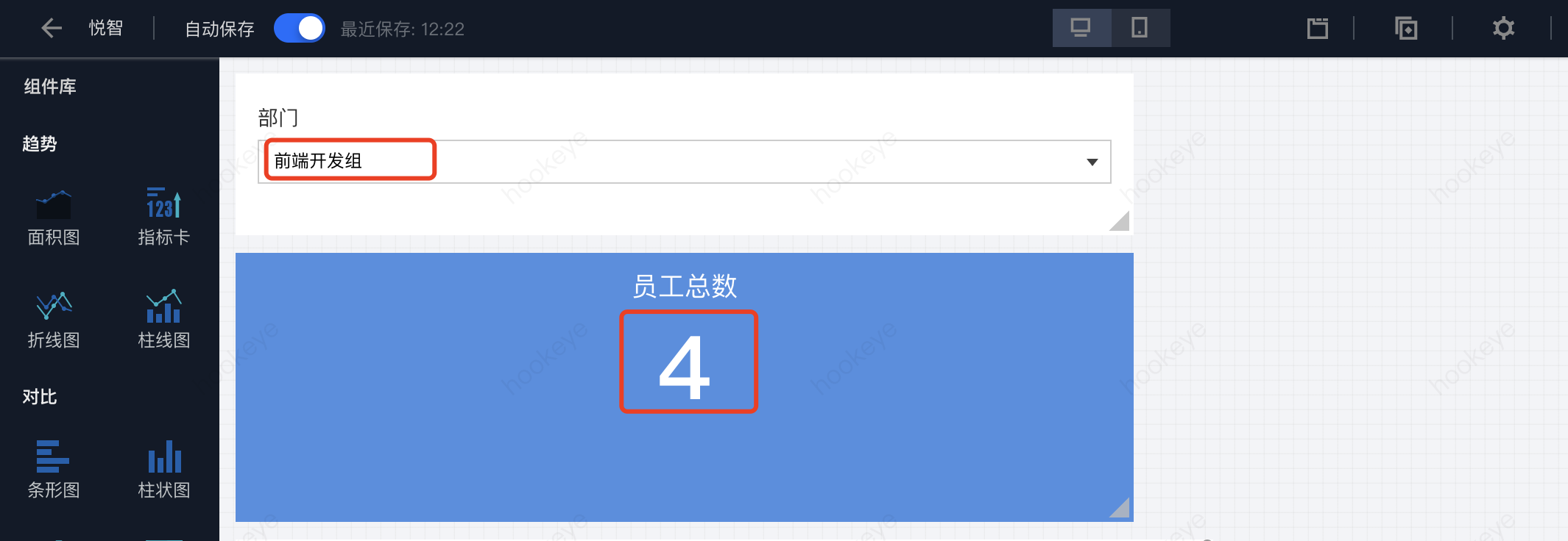 3. 保存,选择部门“前端开发组”,可见“emp_total”会展示动态的数据值。