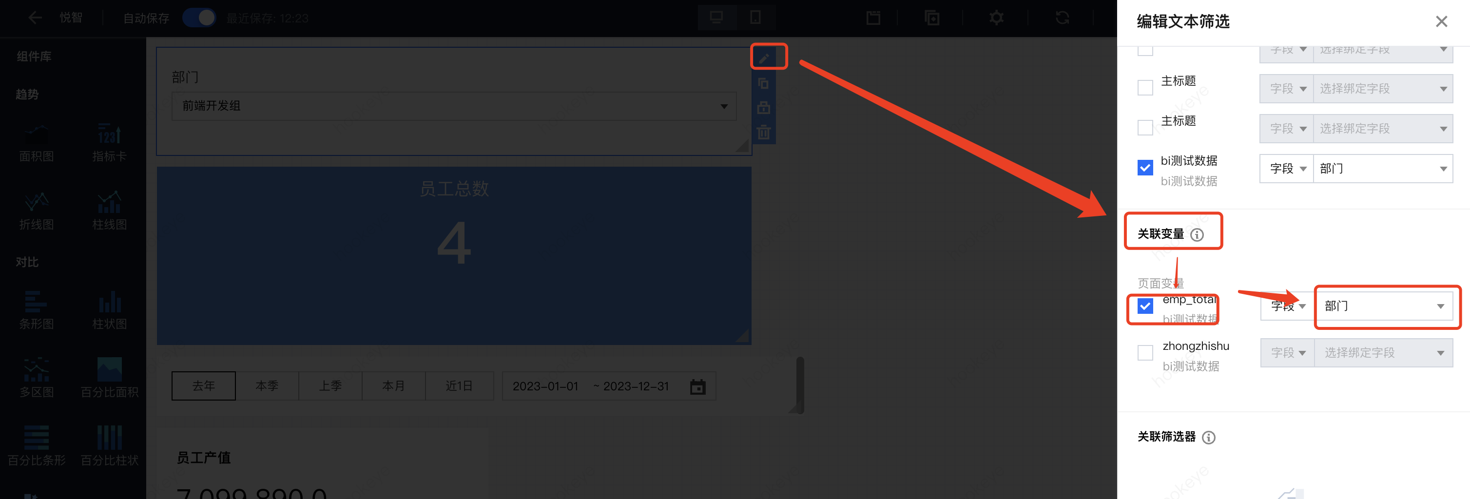 2. 设置筛选器联动变量:选择联动变量“emp_total”,以“部门”字段为条件关联;