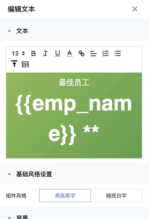 2.2 输入文本内容,在需要替换的部分,插入变量 > 选择页面变量“{{emp_total}}”: