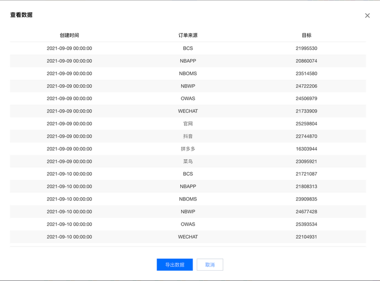在弹层中,用户可以查看图表对应的结果数据,也可以对数据进行导出。