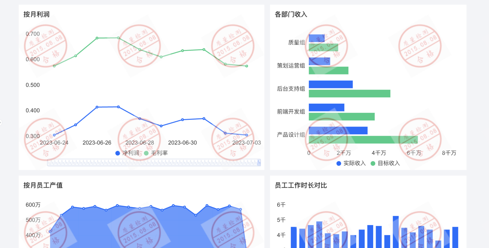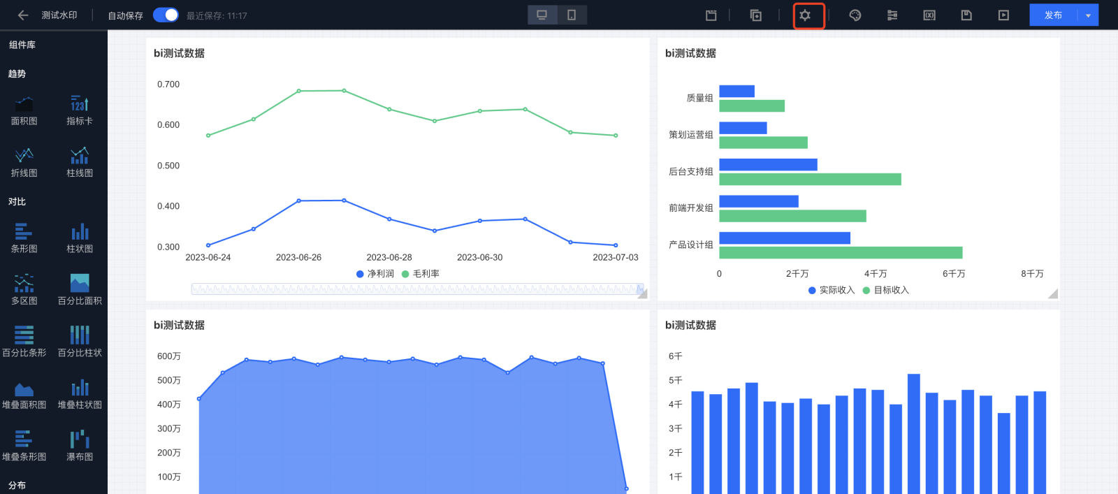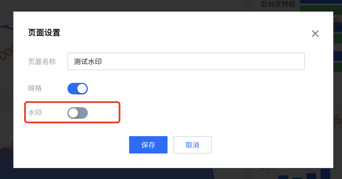水印文本 | 支持输入静态值,也可以按照界面说明输入变量值 | 只需要提示“仅供内部传阅”,则只需输入“仅供内部传阅” 报表水印中展示当前账户 id,则可输入“{{$bi.subuin}}” |