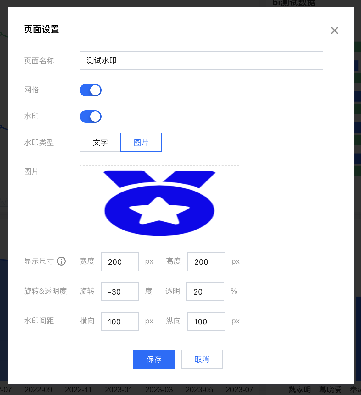 显示尺寸 | 默认会按照上传的图片原尺寸,对于图片太大或太小情况,支持重新设置图片的显示区域,设置后,图片将在该尺寸区域内显示(等比缩放居中显示) | 原始图片尺寸2000*1000,希望在报表上不变形,且不会太大覆盖了整个图表,可以设置将图片显示为200*100的图片 |