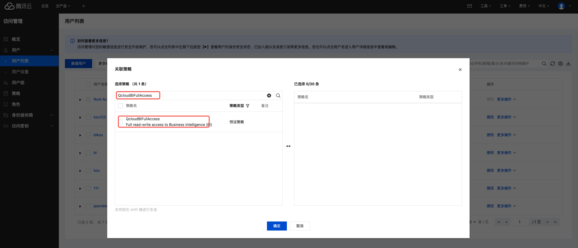 本文档介绍如何帮首次开通腾讯云 BI 使用的 CAM 子账户、或者需要授权使用腾讯云 BI 产品的 CAM 子账户,在腾讯云控制台进行 BI 产品使用权限开通。