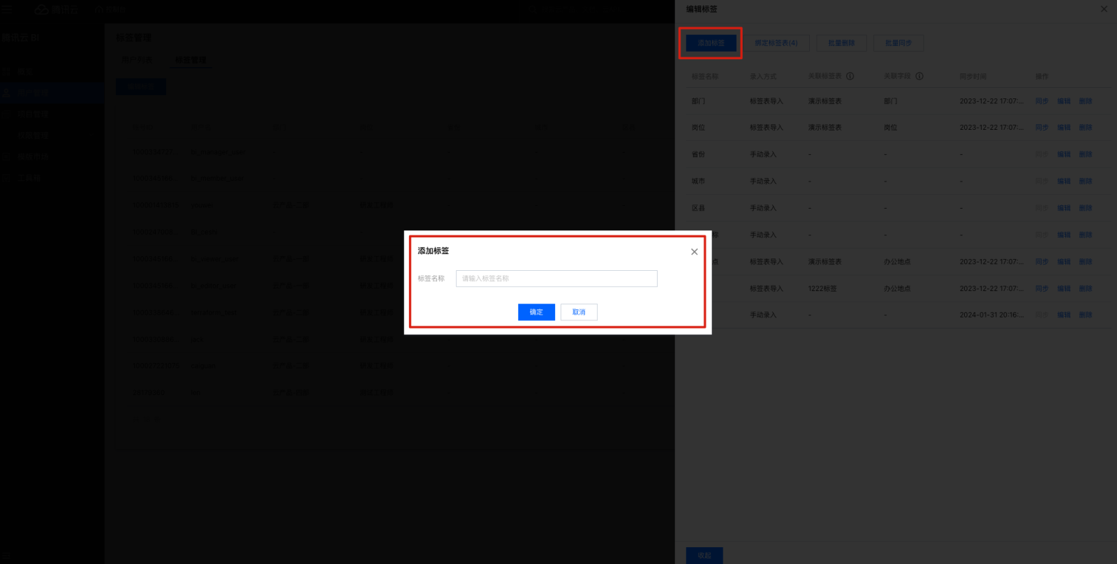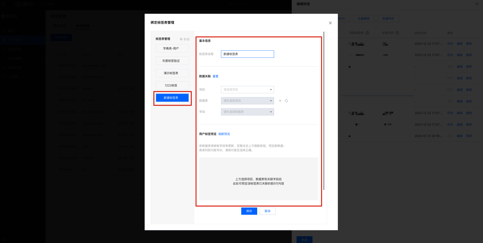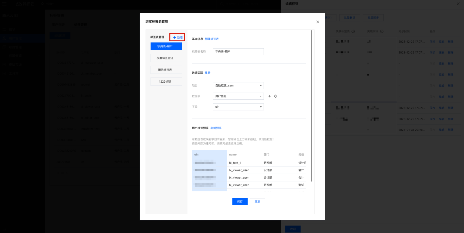 3. 单击添加标签,在弹窗中输入标签名称,单击确定即可添加标签。 6. 编辑标签表名称,选择需要关联的标签表所属项目、数据表和字段,该字段和用户管理的账号 ID 匹配,建立映射关系。 7. 如果没有对应的数据表,单击+,添加数据表,单击刷新数据表列表。 8. 用户标签预览可以查看匹配关系,单击刷新预览可以查看前5行的匹配关系。