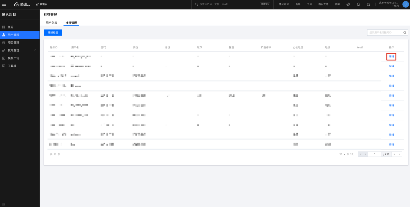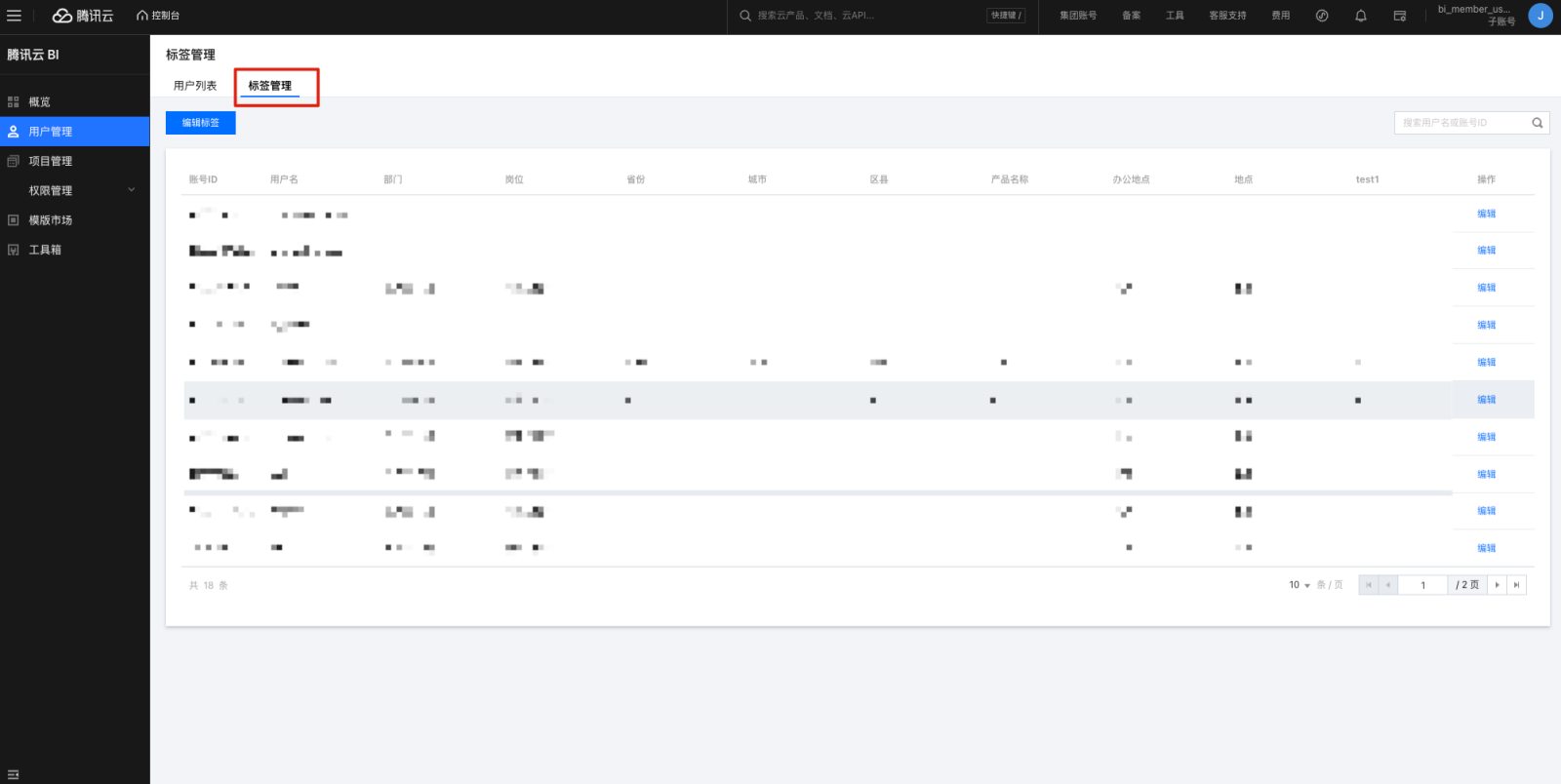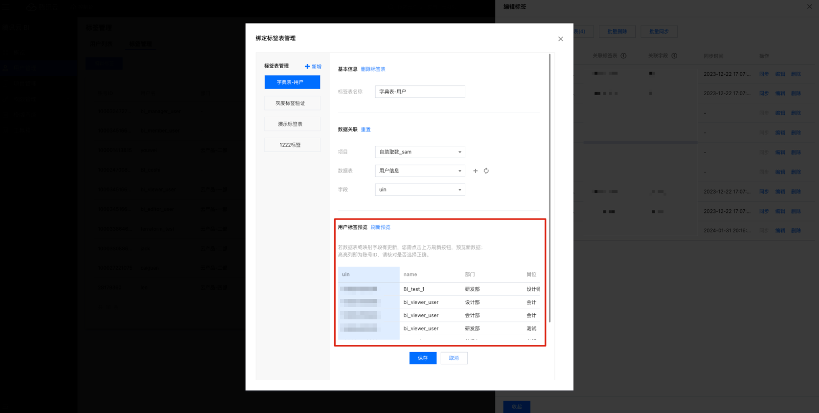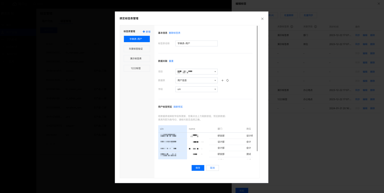 3. 单击添加标签,在弹窗中输入标签名称,单击确定即可添加标签。 6. 编辑标签表名称,选择需要关联的标签表所属项目、数据表和字段,该字段和用户管理的账号 ID 匹配,建立映射关系。 7. 如果没有对应的数据表,单击+,添加数据表,单击刷新数据表列表。 8. 用户标签预览可以查看匹配关系,单击刷新预览可以查看前5行的匹配关系。