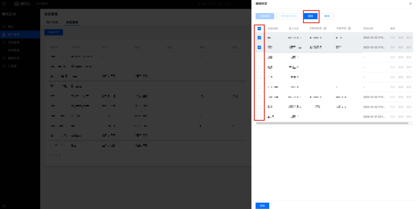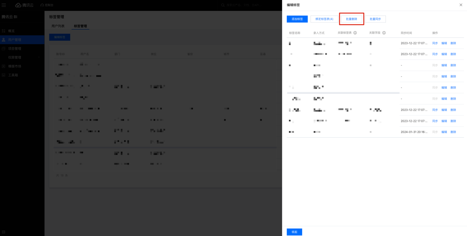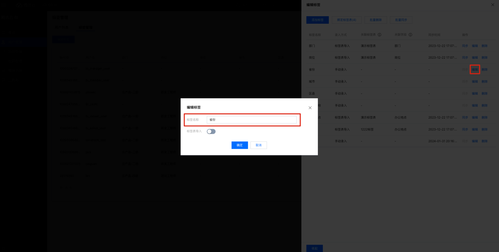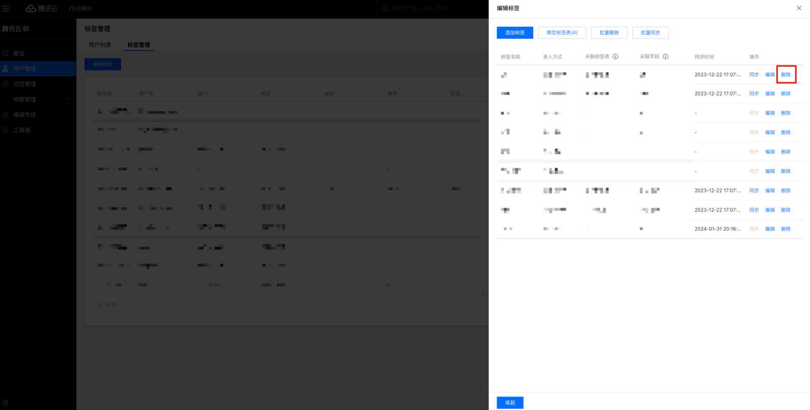 9. 编辑标签支持标签表导入确定标签表和关联字段,建立标签和标签表字段的映射关系,以方便后续用户和标签值匹配。 10. 导入标签表的标签,支持同步功能,单击后同步标签值。单击批量同步,勾选已导入数据表的标签批量同步。 删除标签操作步骤