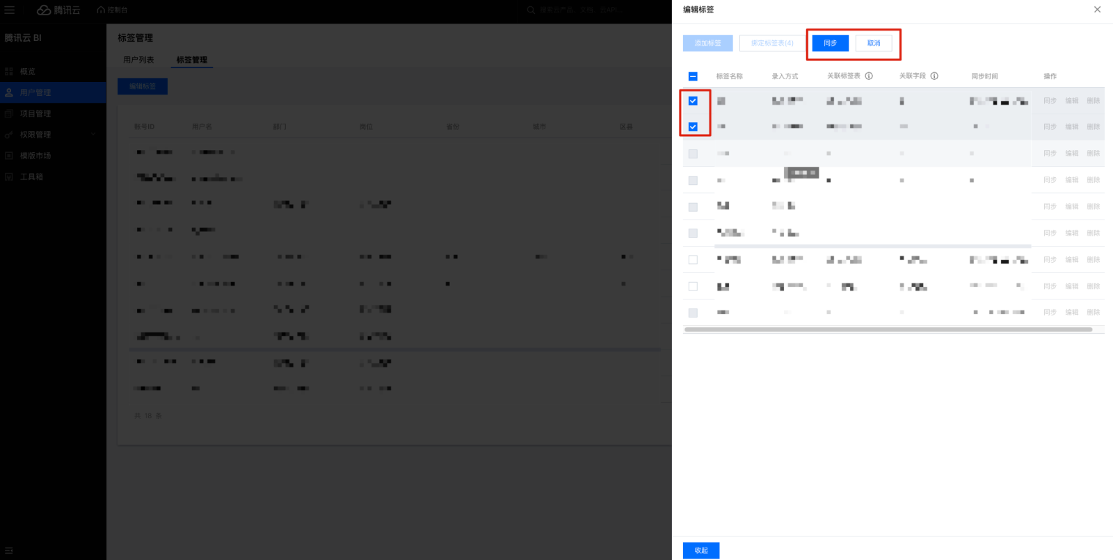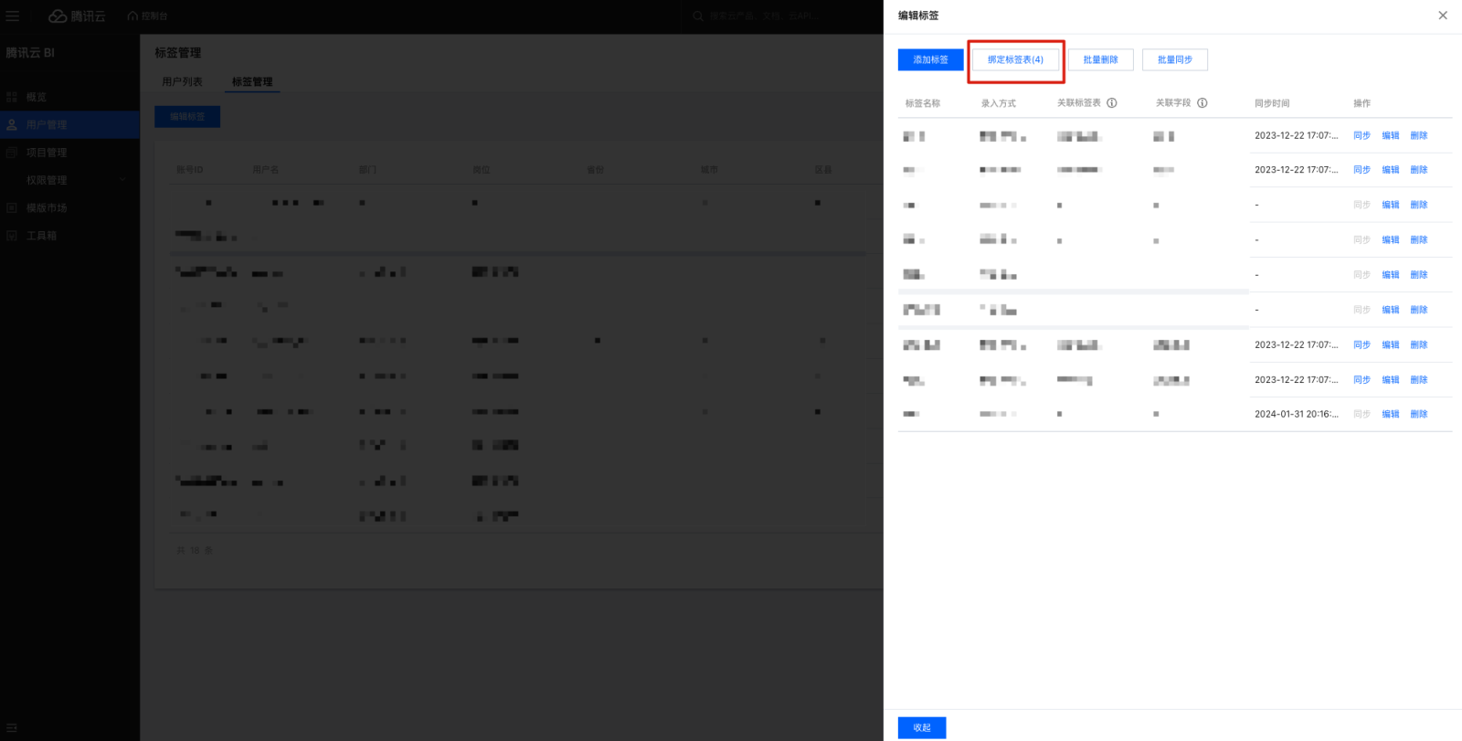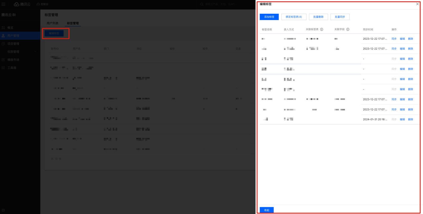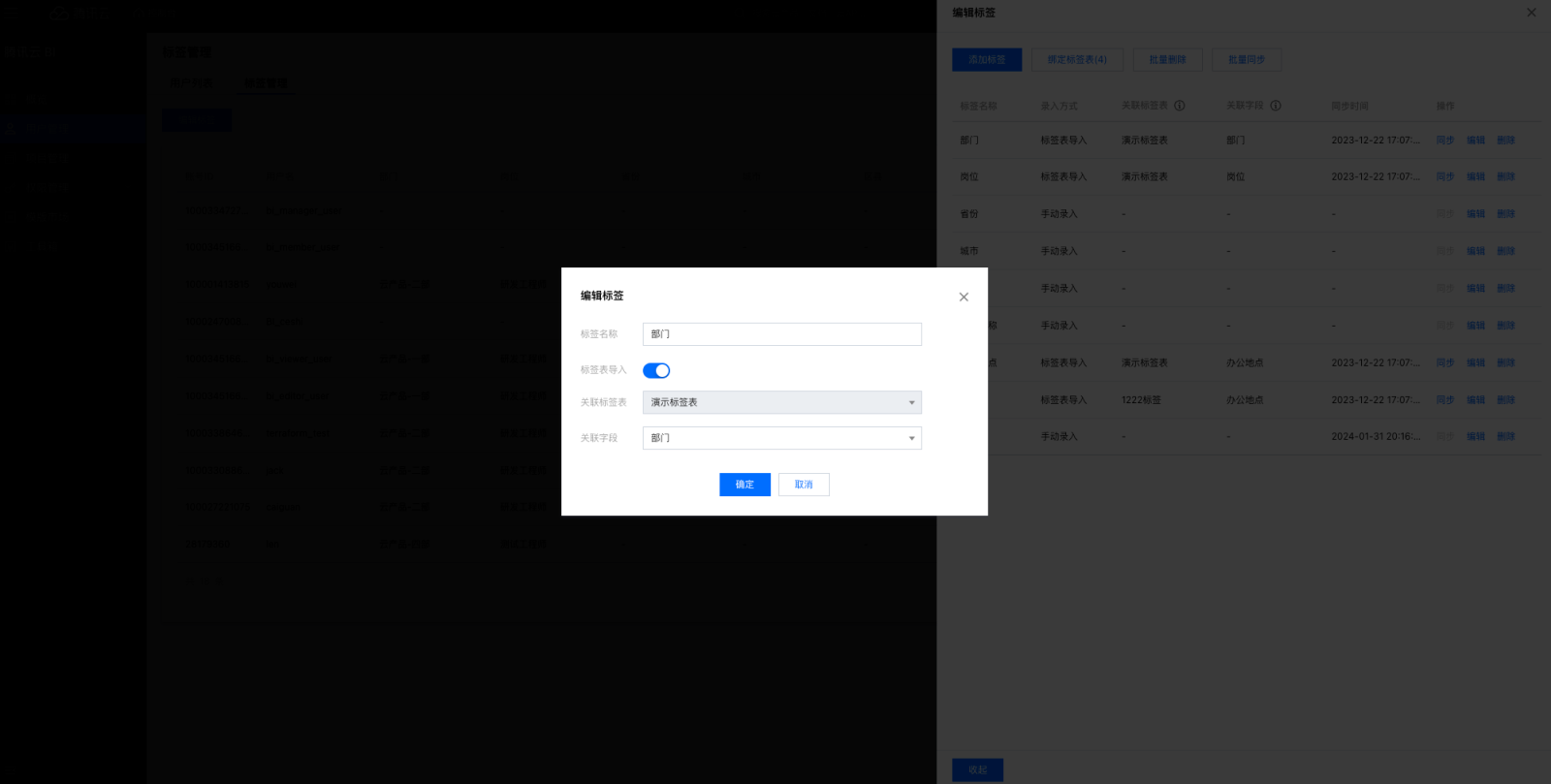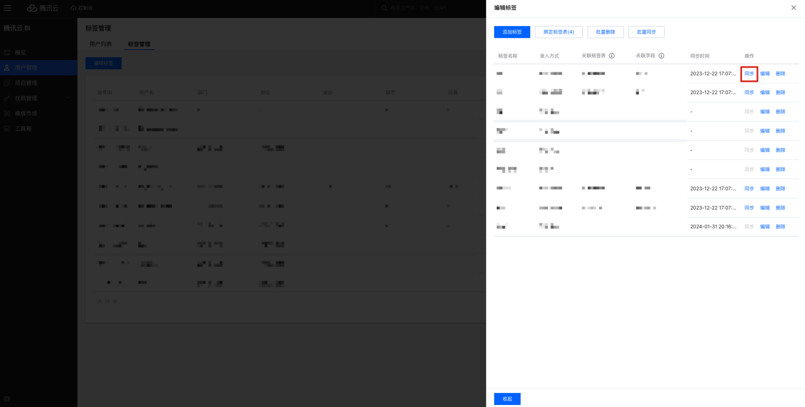 9. 编辑标签支持标签表导入确定标签表和关联字段,建立标签和标签表字段的映射关系,以方便后续用户和标签值匹配。 10. 导入标签表的标签,支持同步功能,单击后同步标签值。单击批量同步,勾选已导入数据表的标签批量同步。 删除标签操作步骤