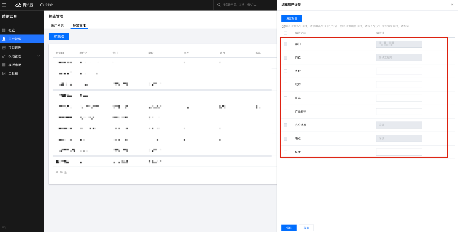 在抽屉中,可编辑该用户所有标签的标签值;