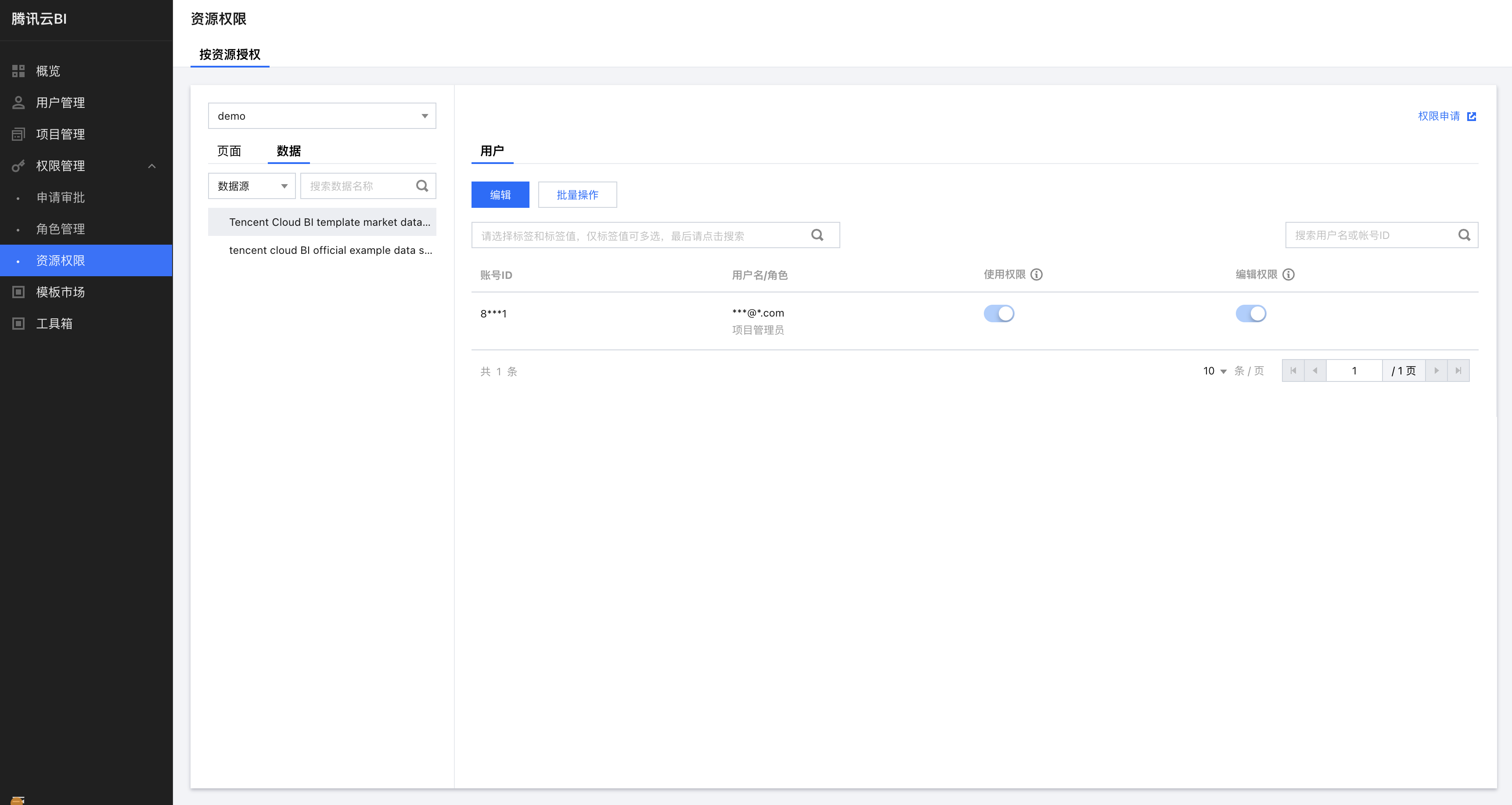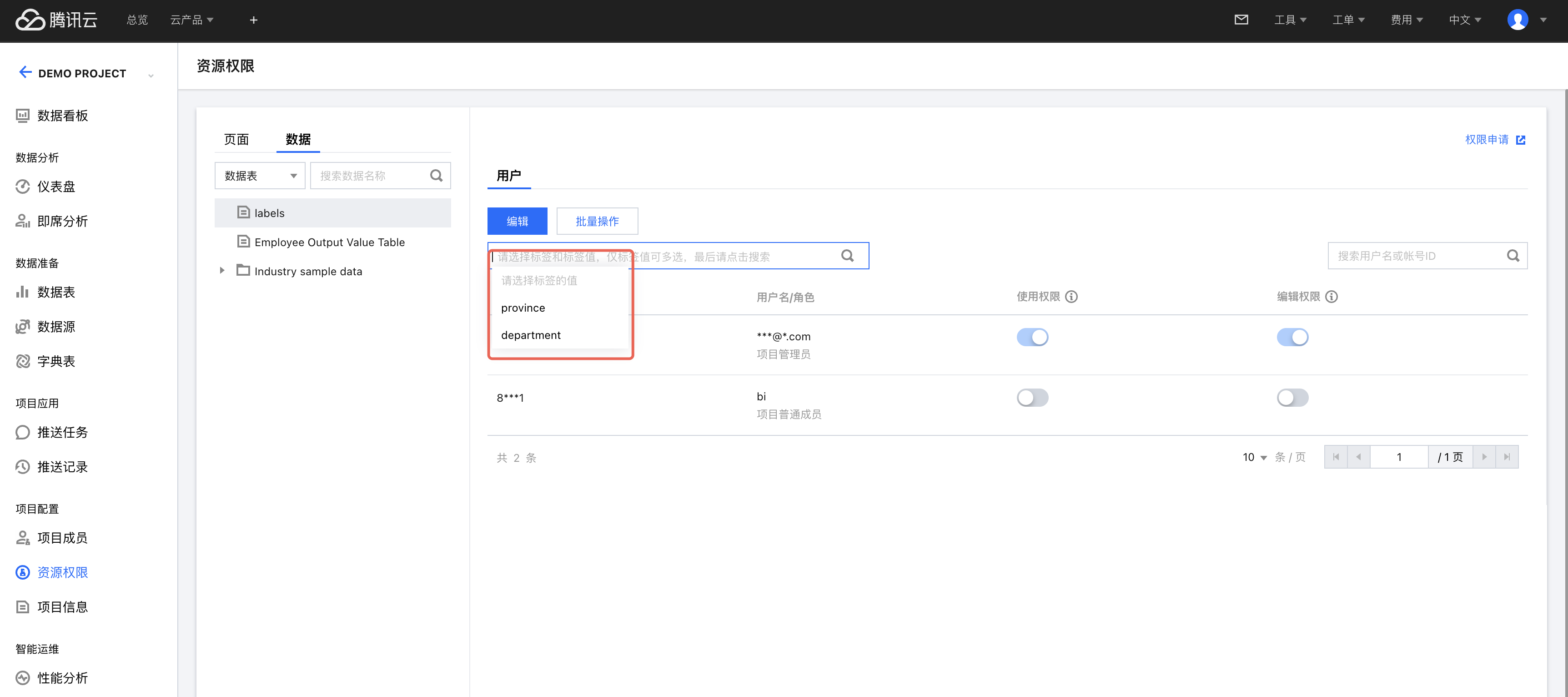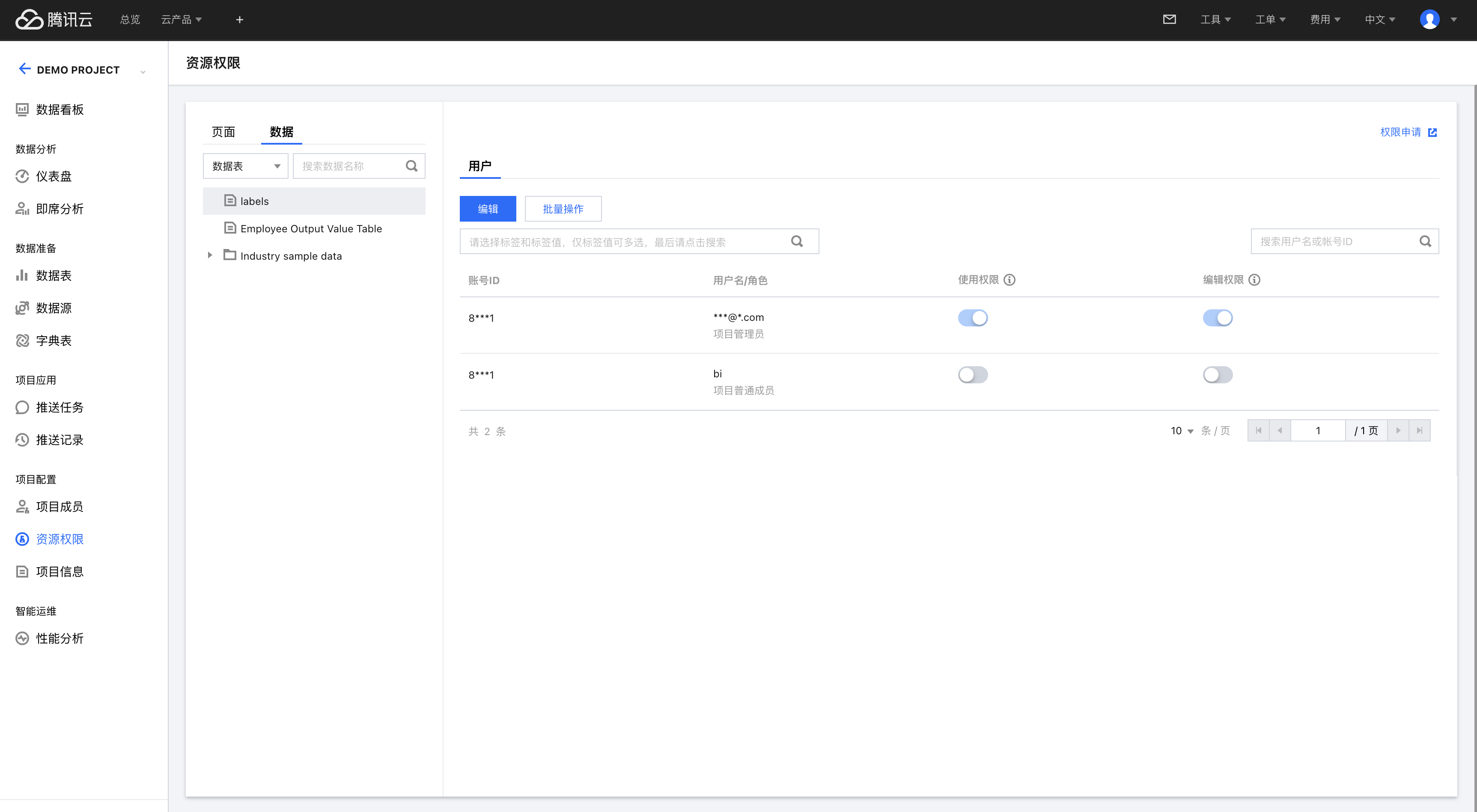 通过腾讯云 BI 产品的页面进行权限管理,可实现不同用户针对不同数据具有不同权限。