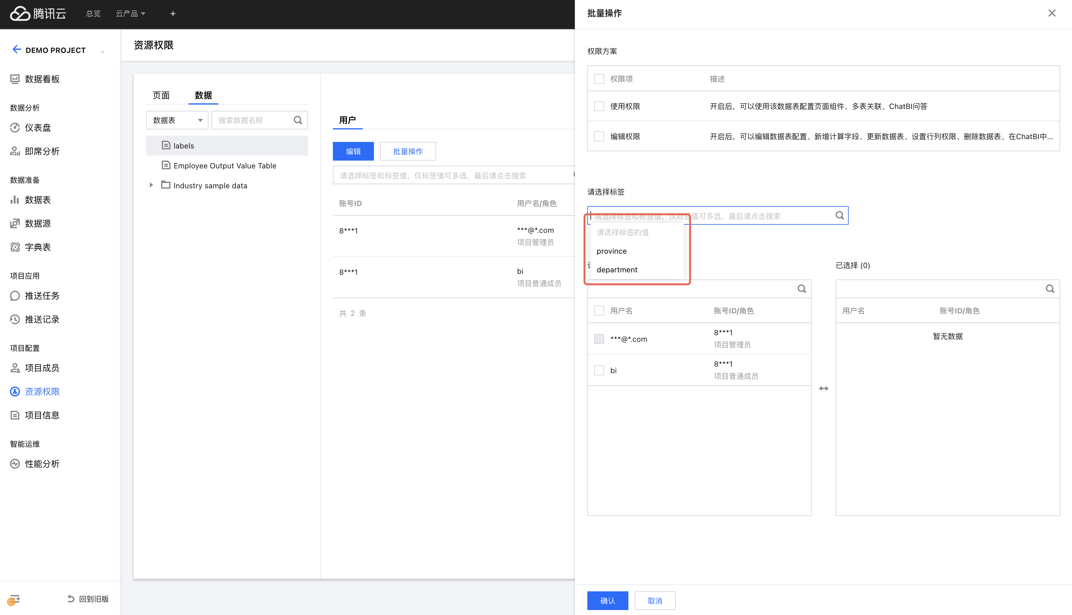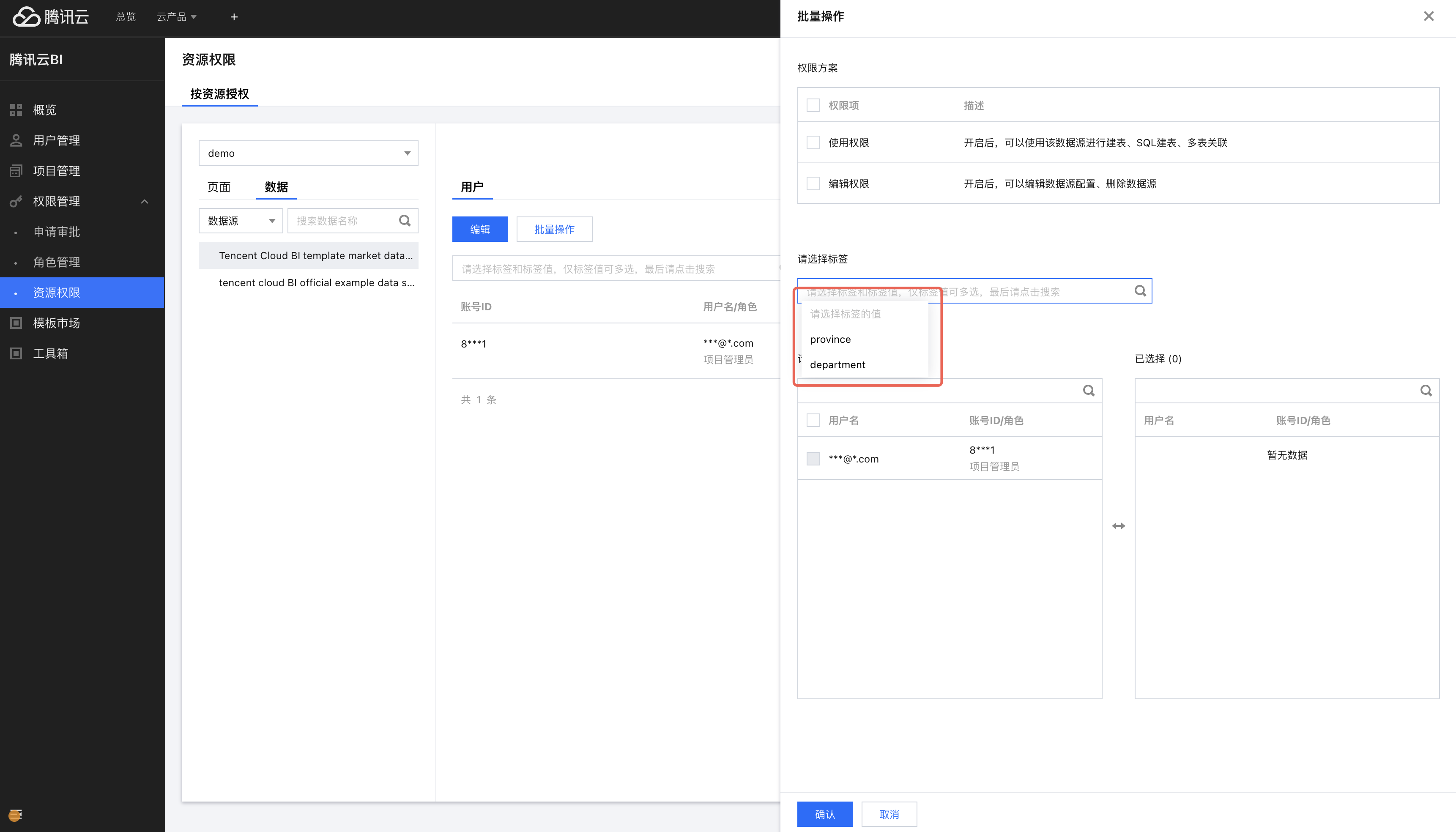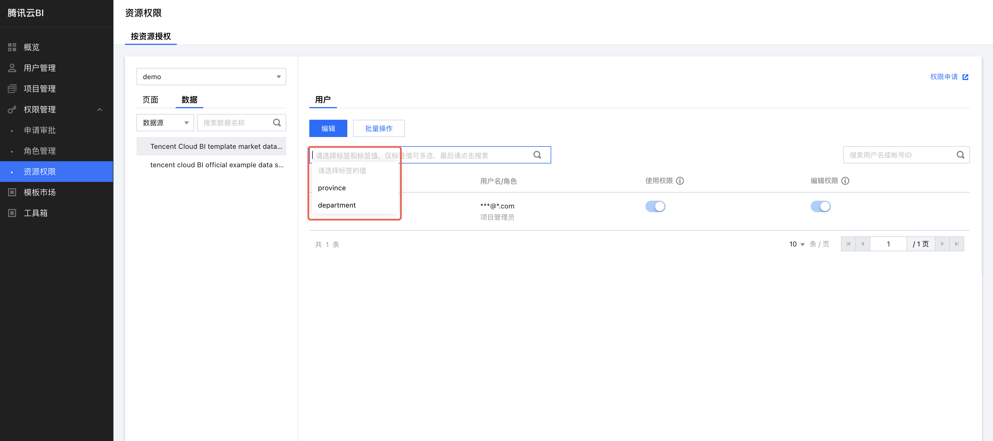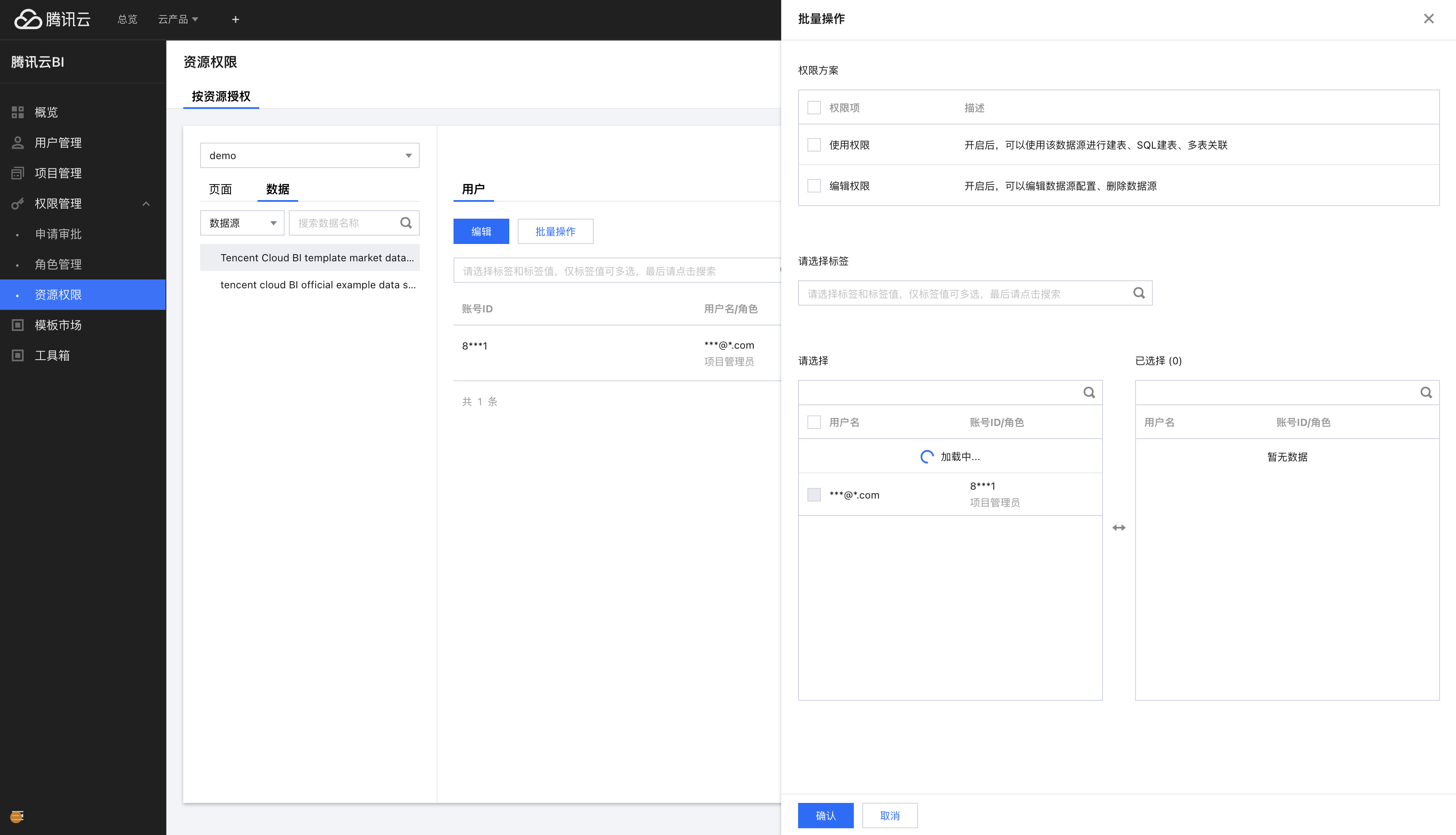 通过腾讯云 BI 产品的页面进行权限管理,可实现不同用户针对不同数据具有不同权限。
