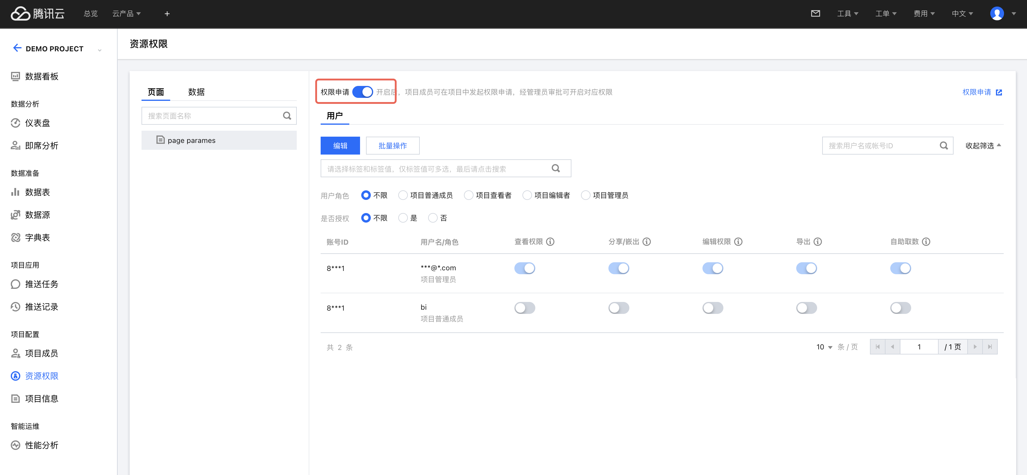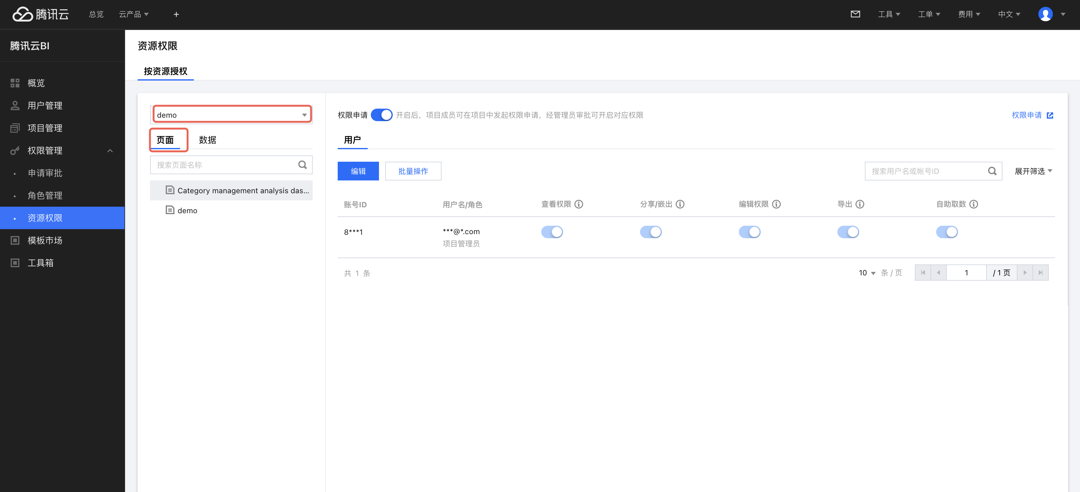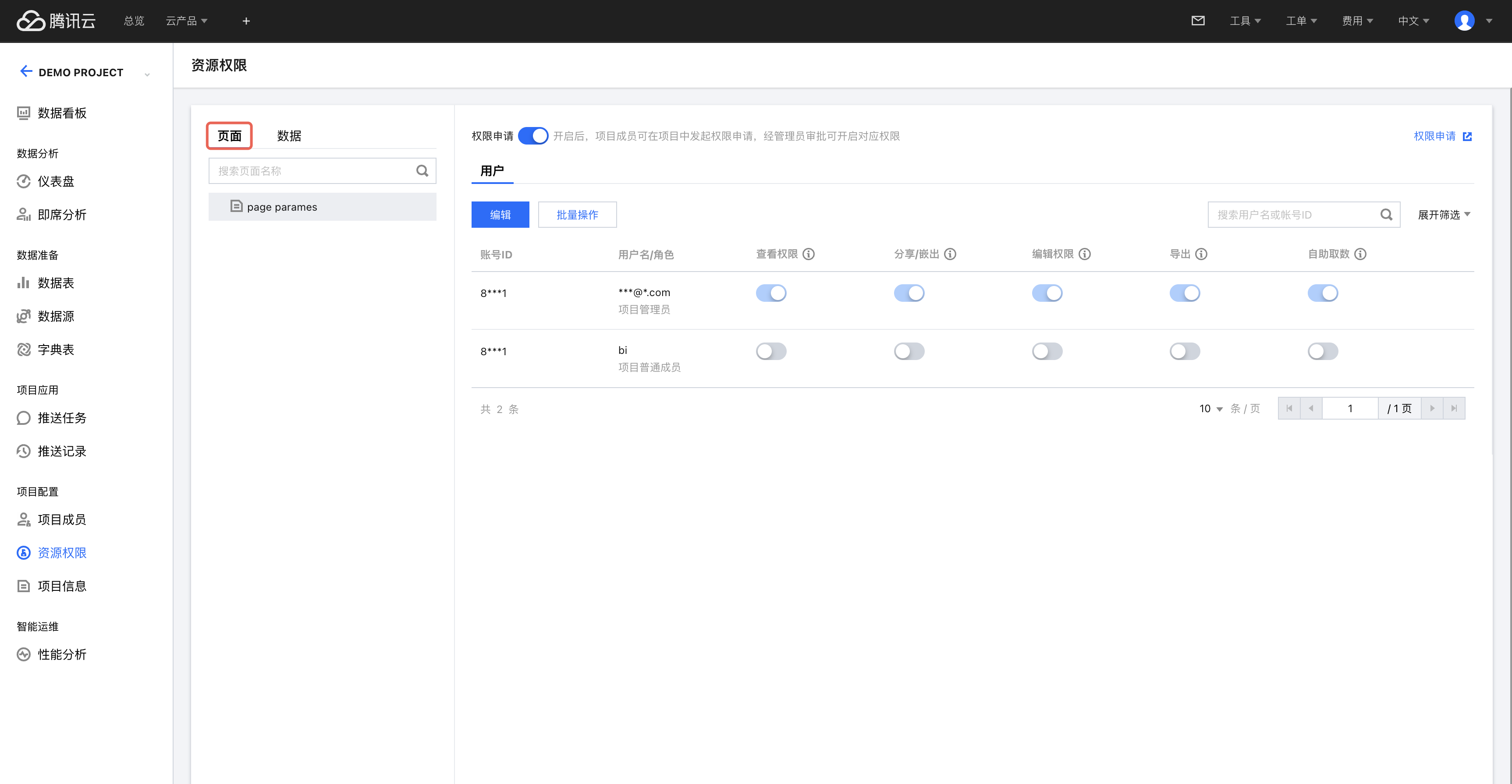 通过腾讯云 BI 产品的页面进行权限管理,可实现不同用户针对不同页面具有不同权限。