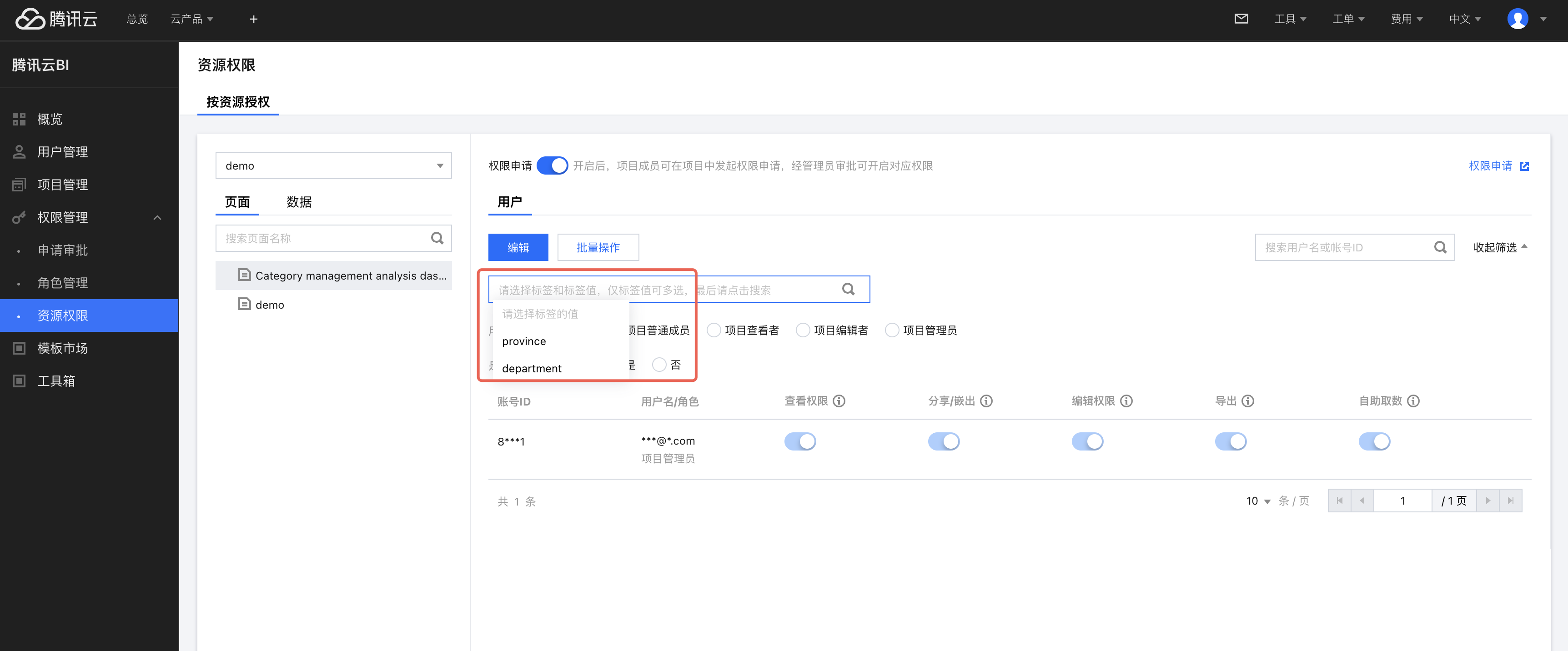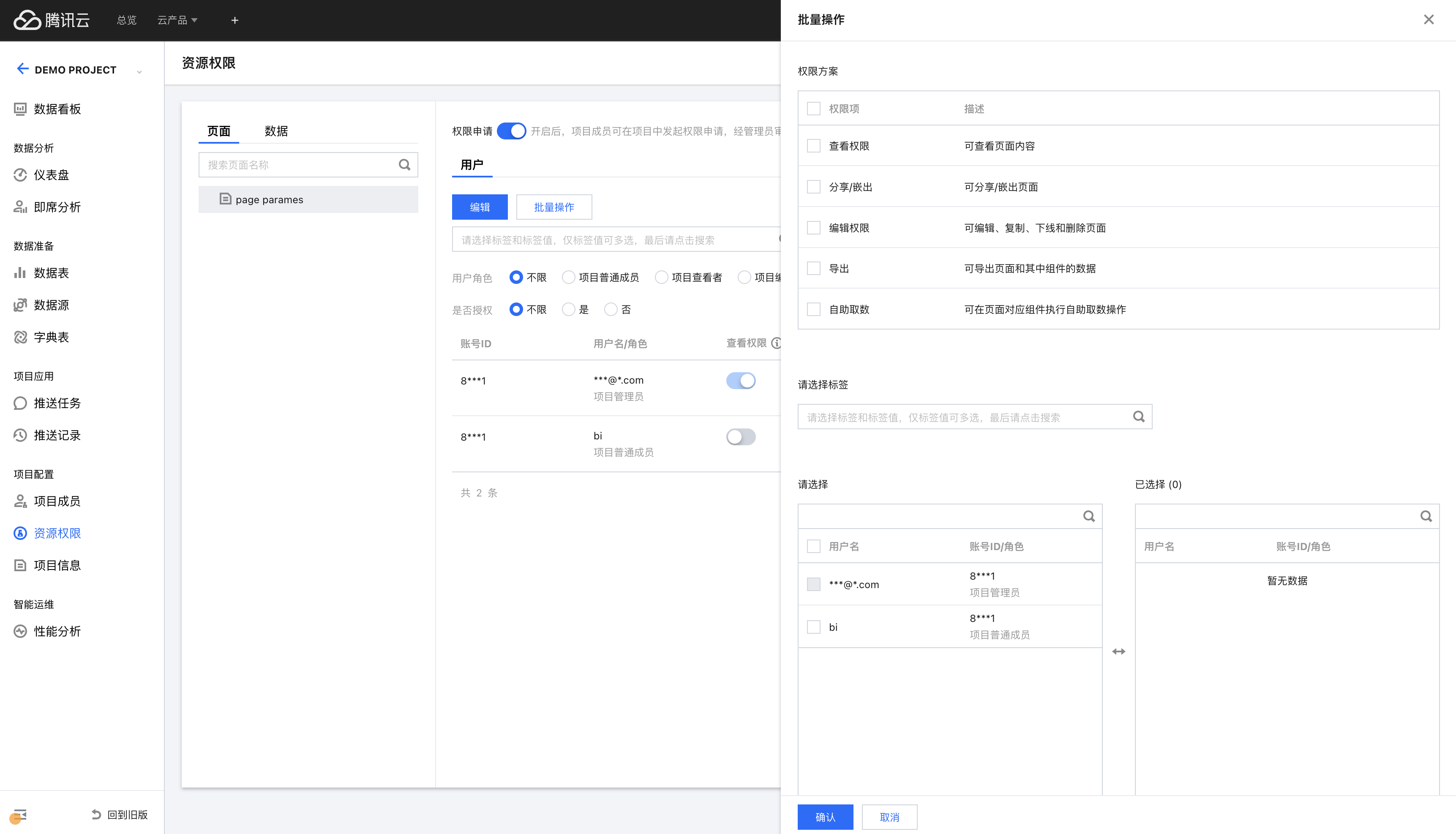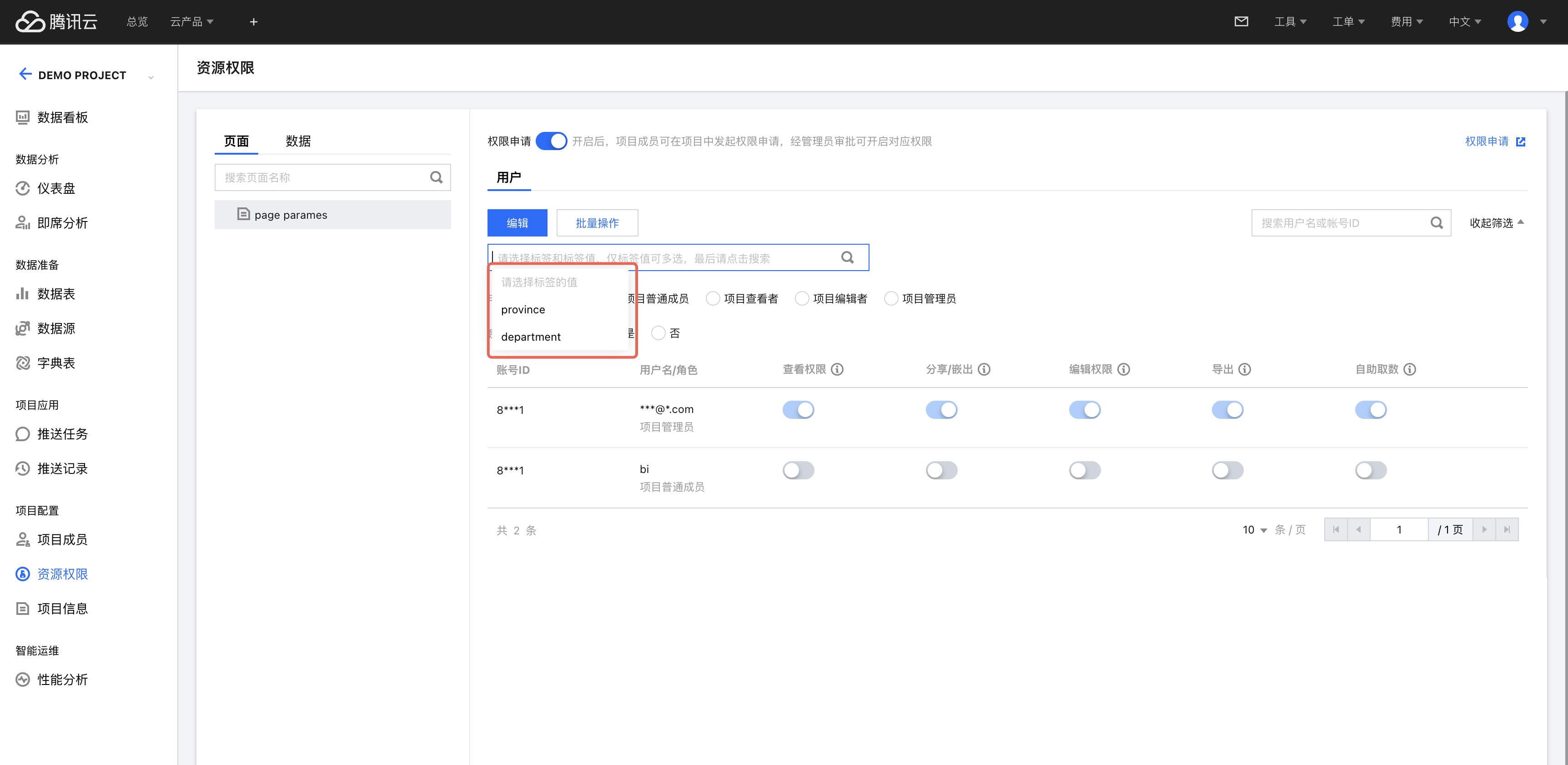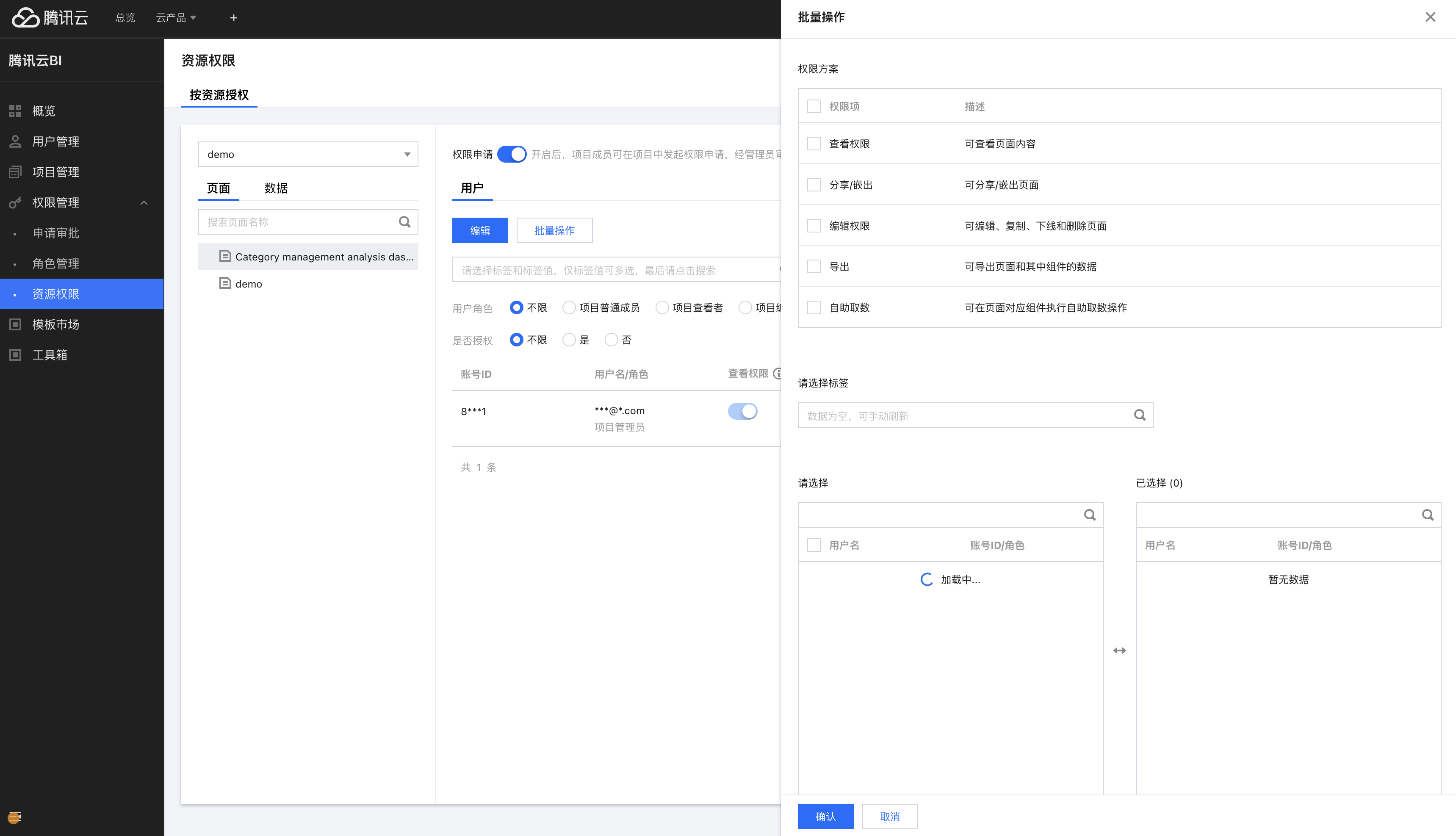 通过腾讯云 BI 产品的页面进行权限管理,可实现不同用户针对不同页面具有不同权限。