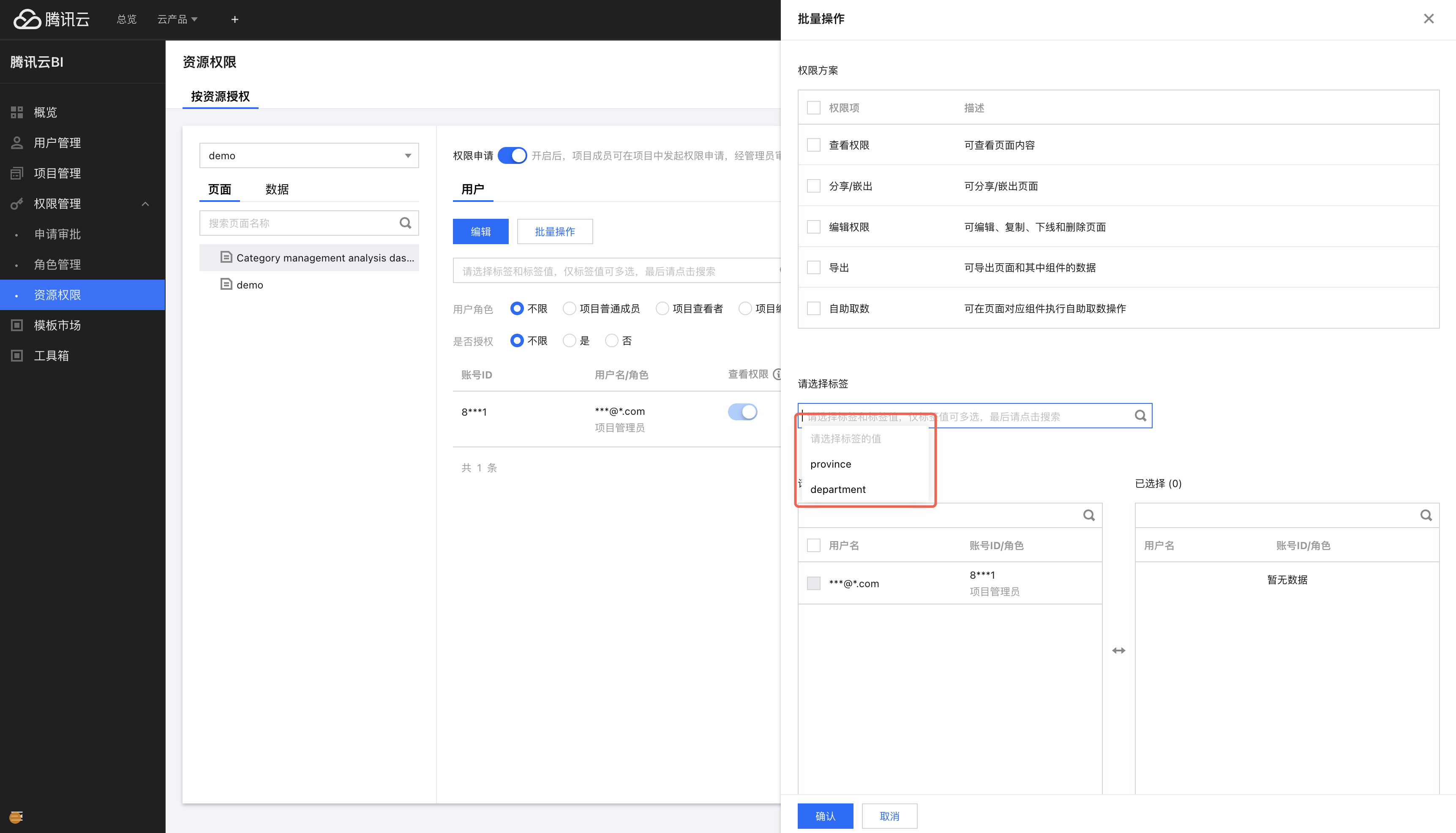 用户角色遵循4中的要求,如果该角色不能添加权限,则勾选框置灰。 支持根据标签管理中配置的标签值筛选用户,然后根据筛选名单批量授权。
