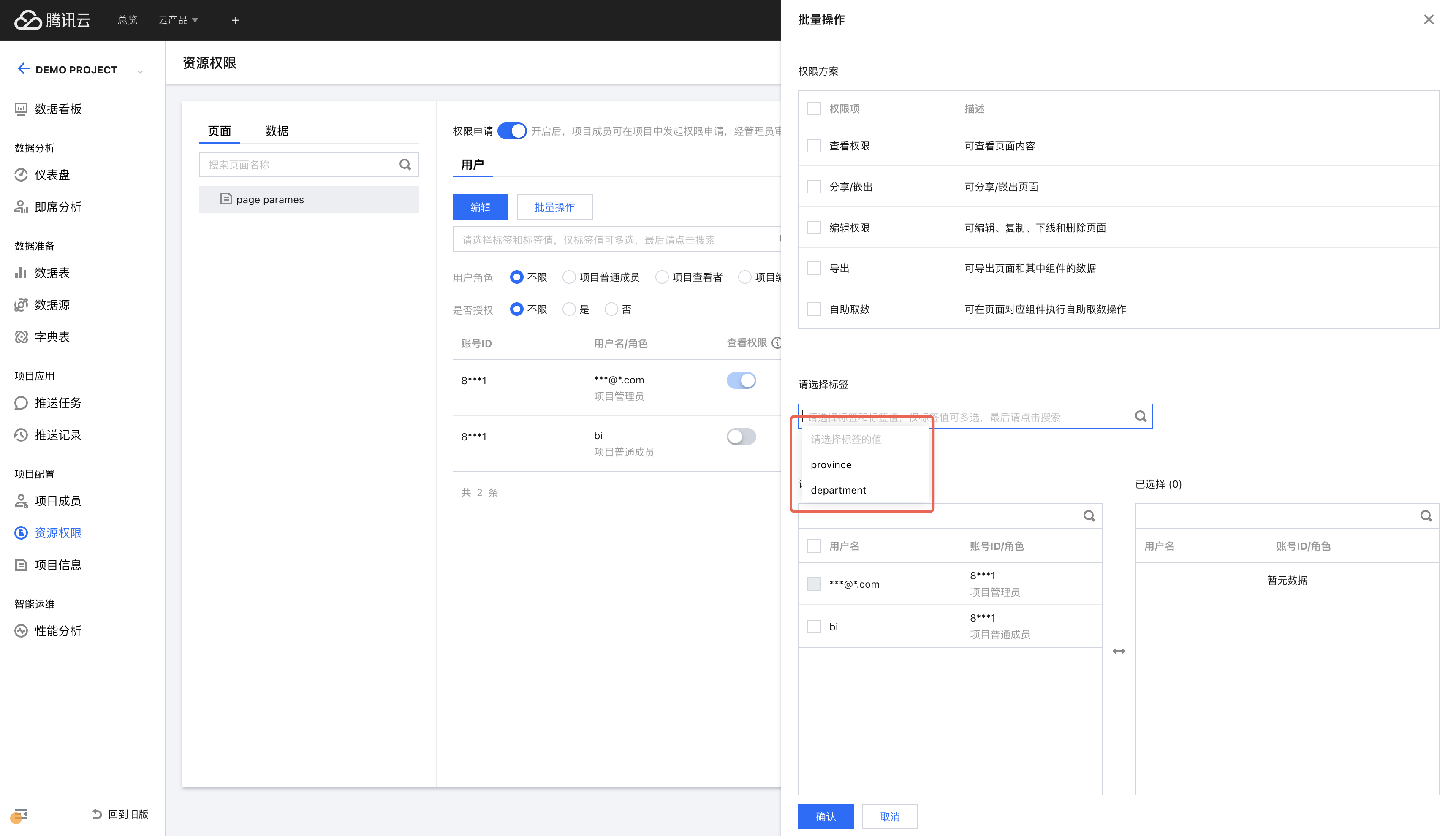 用户角色遵循4中的要求,如果该角色不能添加权限,则勾选框置灰。 支持根据标签管理中配置的标签值筛选用户,然后根据筛选名单批量授权。 项目管理权限进行授权