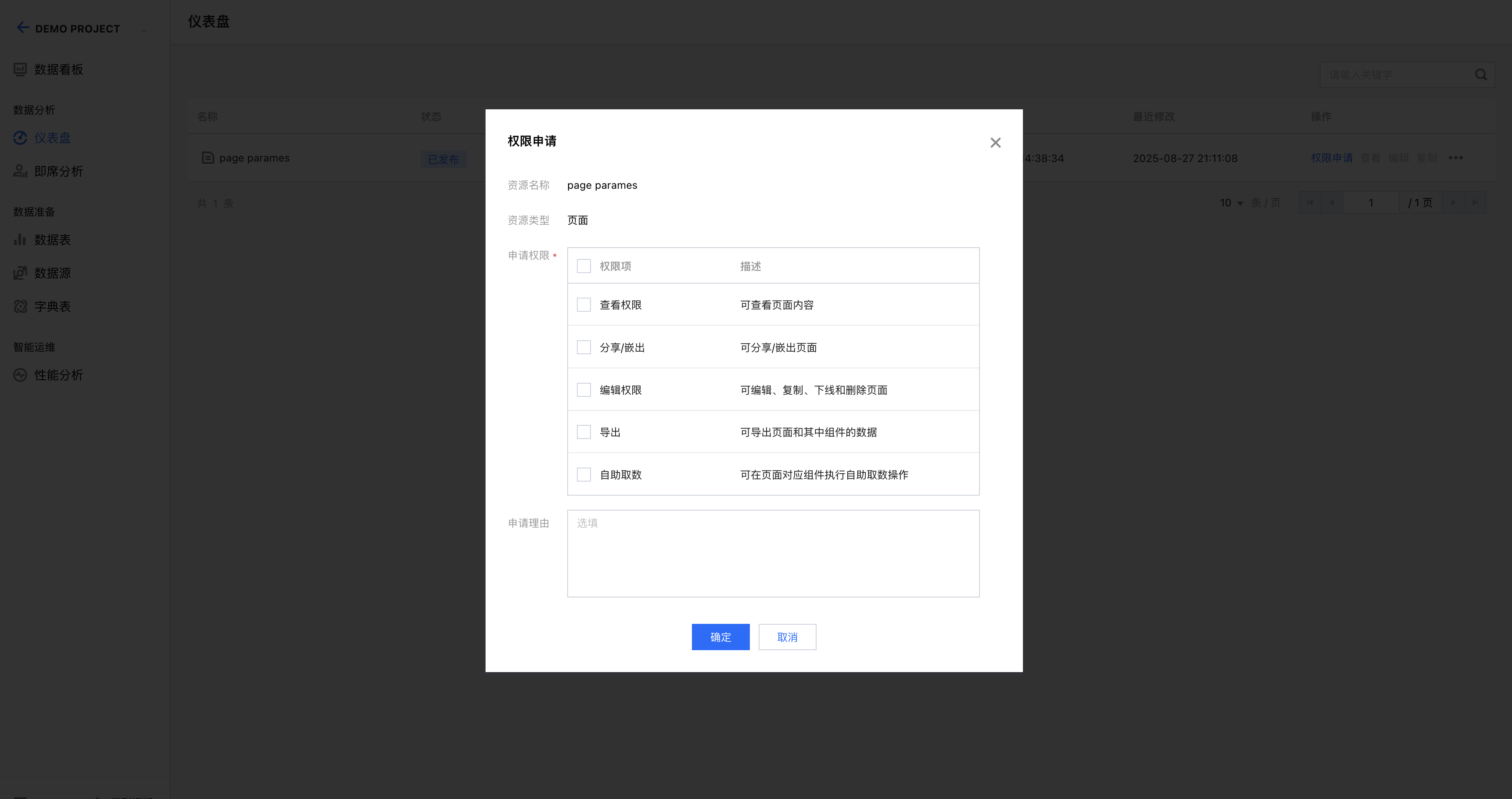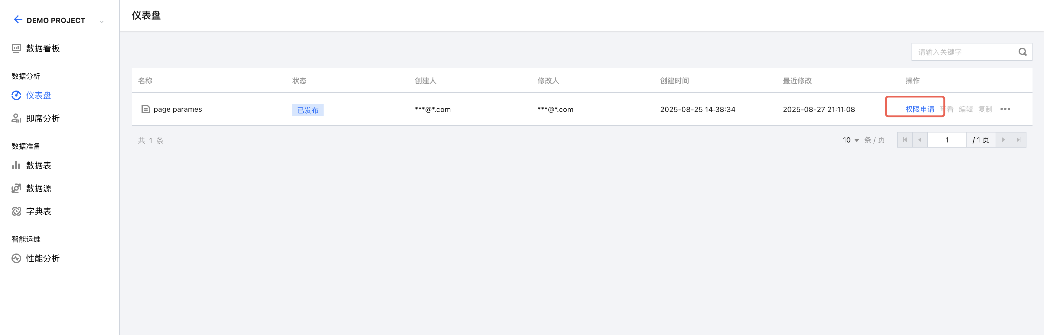 前置条件:权限申请开关打开后,允许用户在仪表盘页面列表中申请权限。