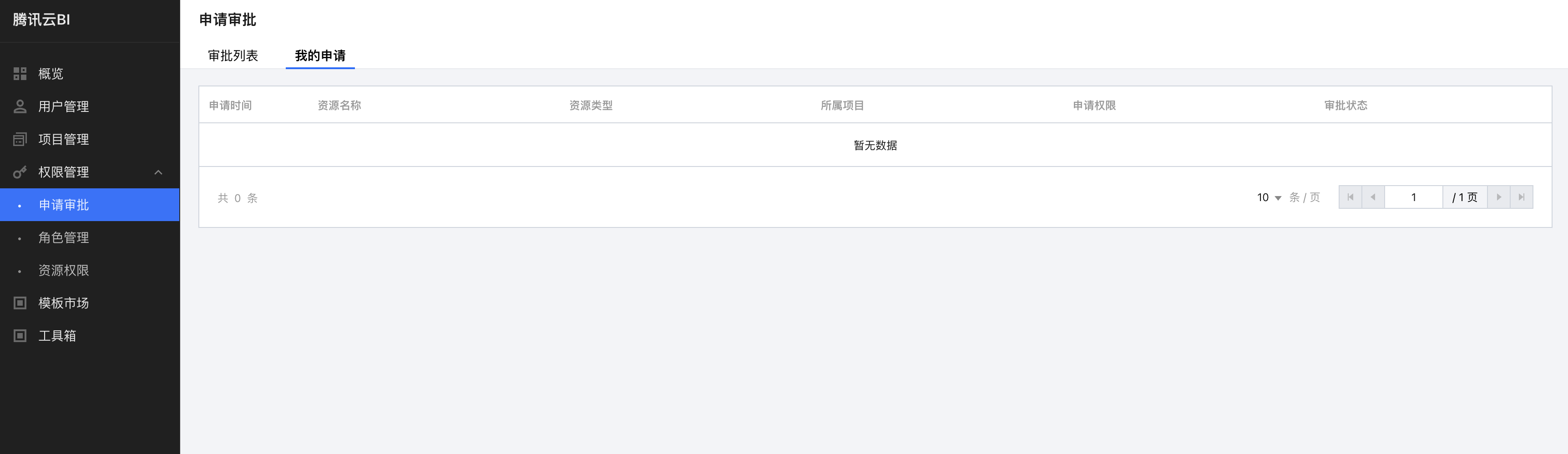 1. 进入项目管理 > 页面 Tab > 权限申请。 2. 在权限申请弹窗里编辑需要的权限,单击确定。 3. 权限管理 > 申请审批 > 我的申请 Tab,查看申请列表和审批状态。 审批页面权限步骤