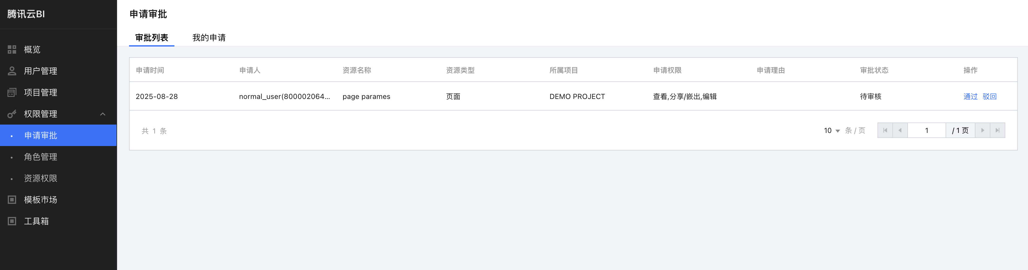 权限管理 > 申请审批 > 审批 Tab,查看申请列表进行操作,支持通过或者驳回。