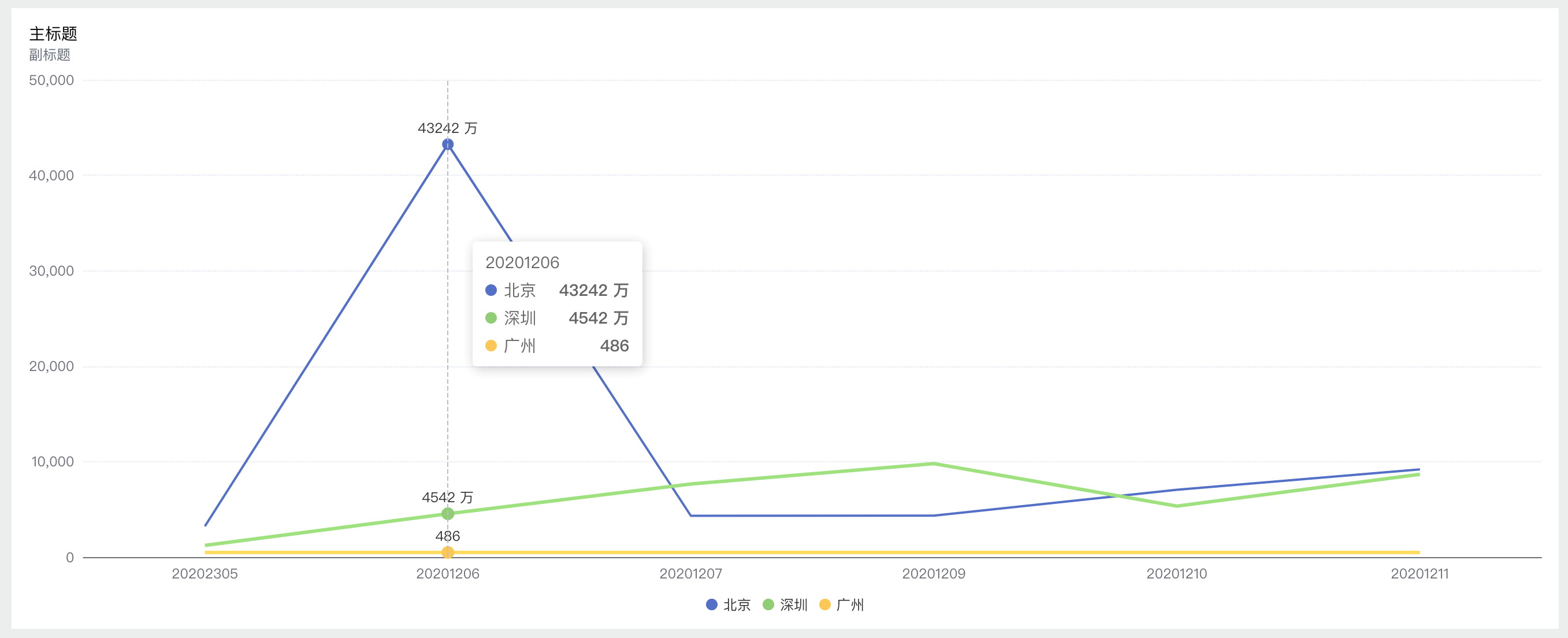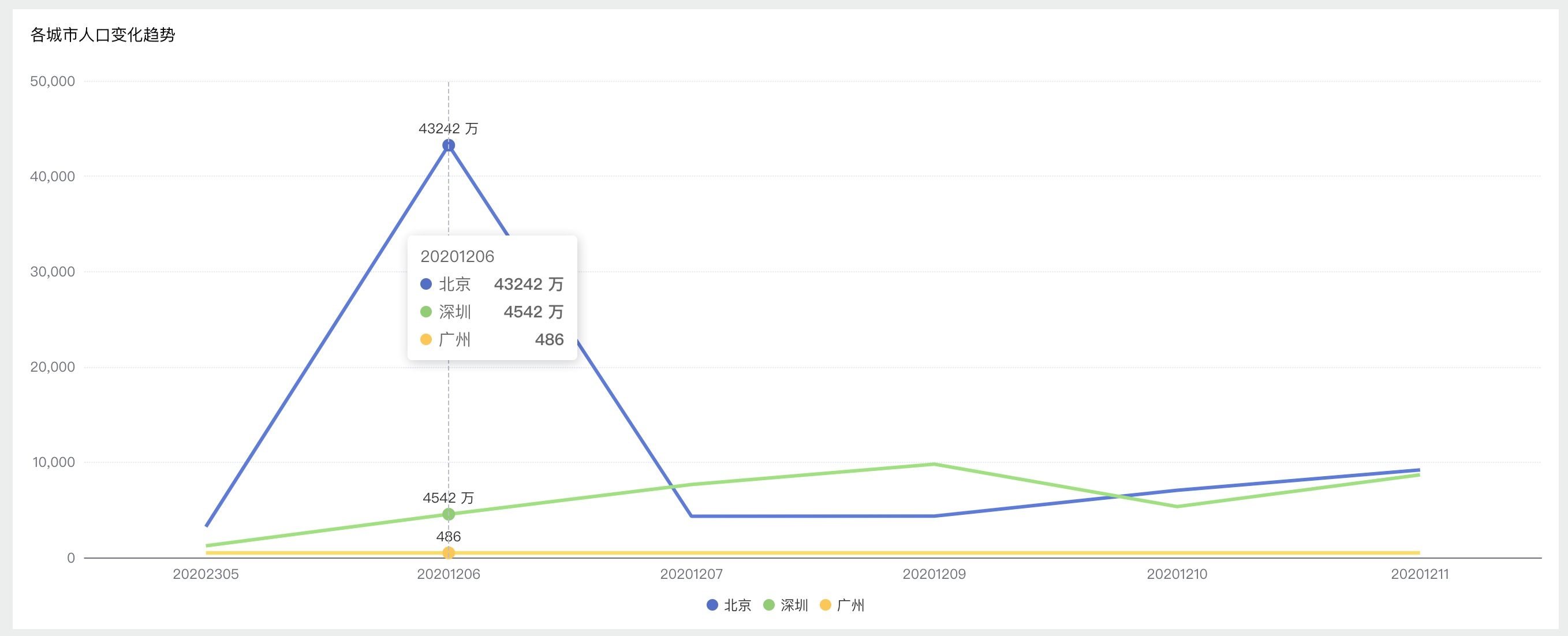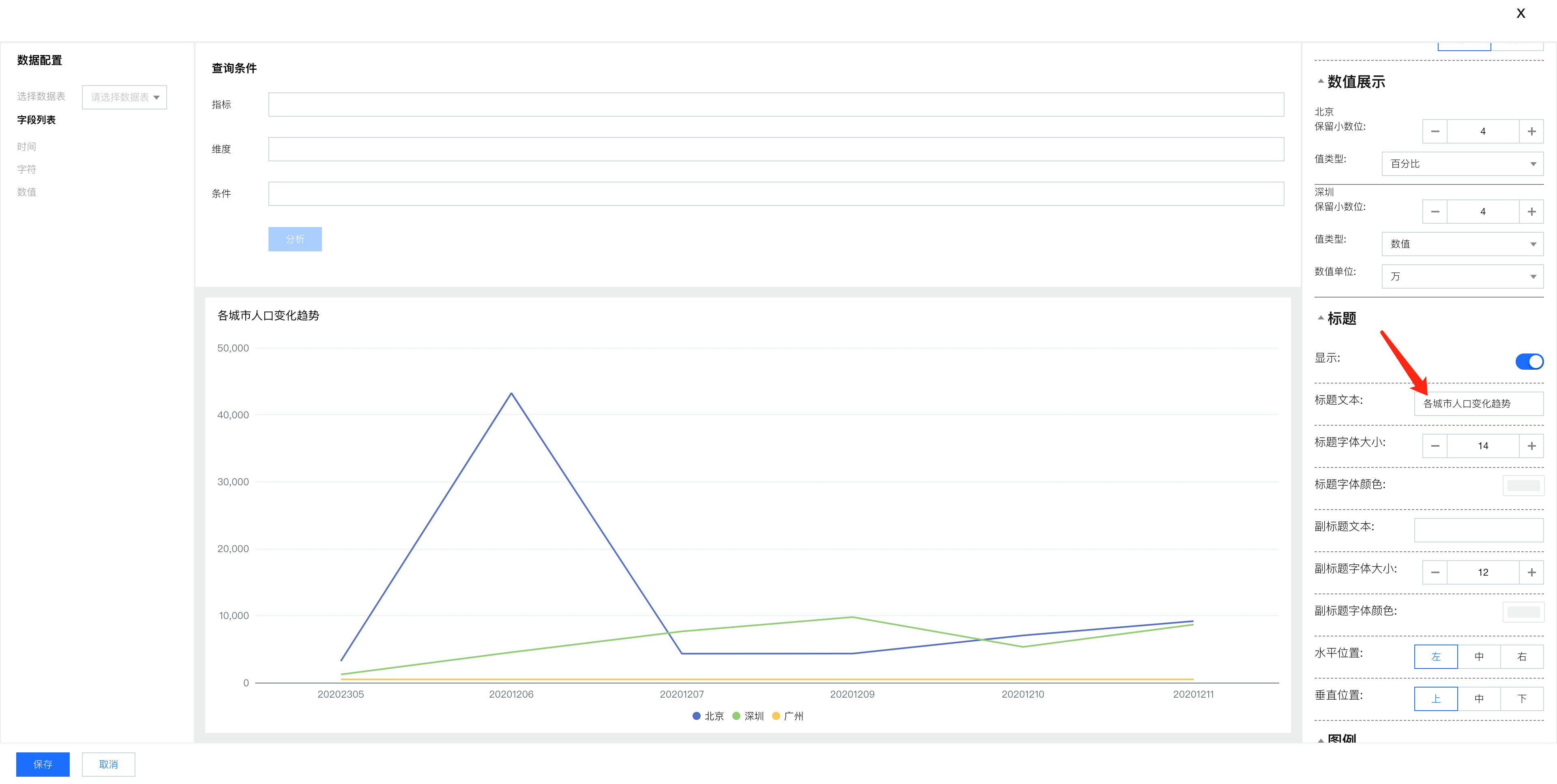 在左侧选择数据表后,拖拽维度“日期”“城市”到维度轴,拖拽“人口数”到指标轴,单击分析得到趋势图。