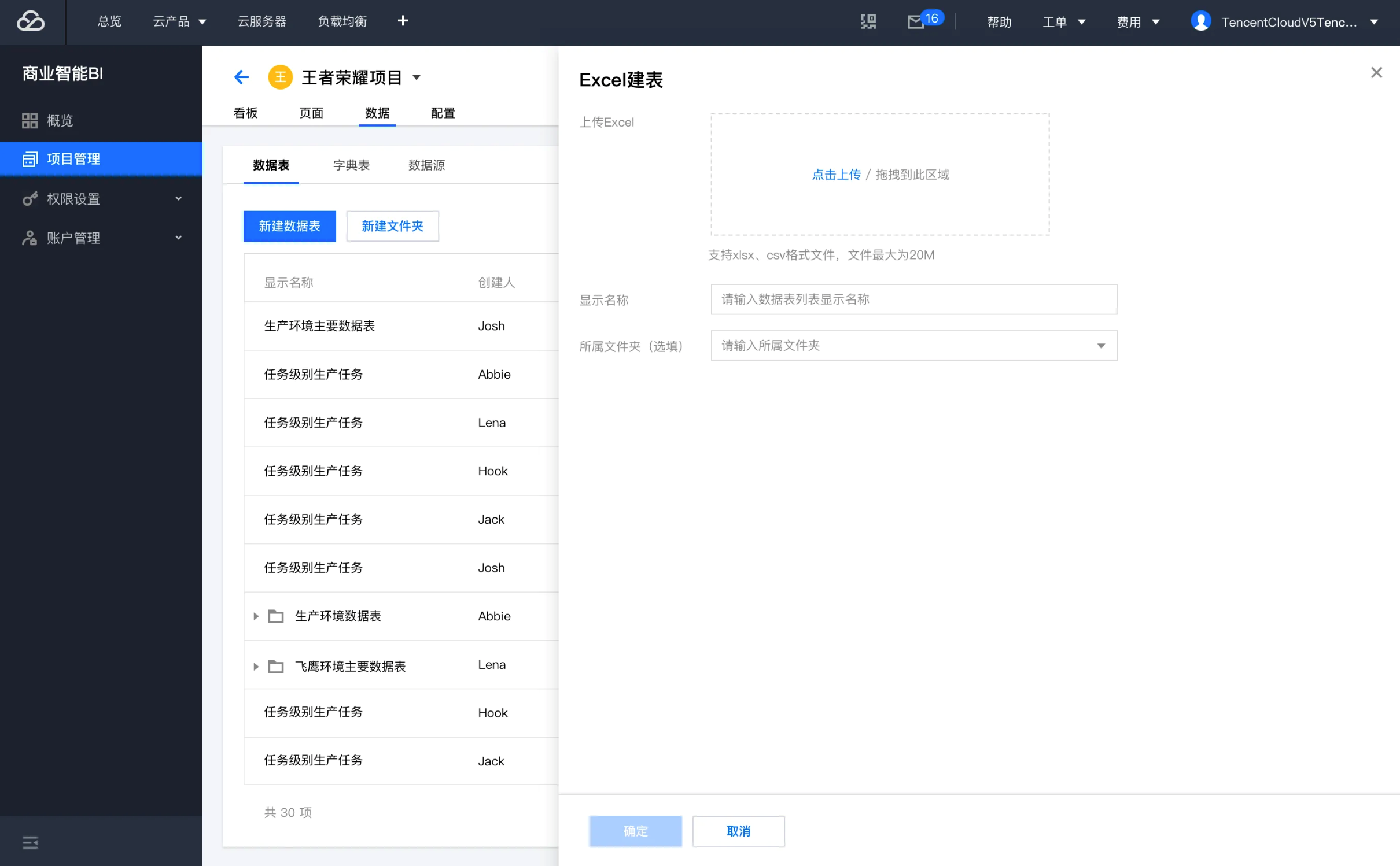 选择 Excel 文件进行上传,并填写显示名称、所属文件夹等基本信息。