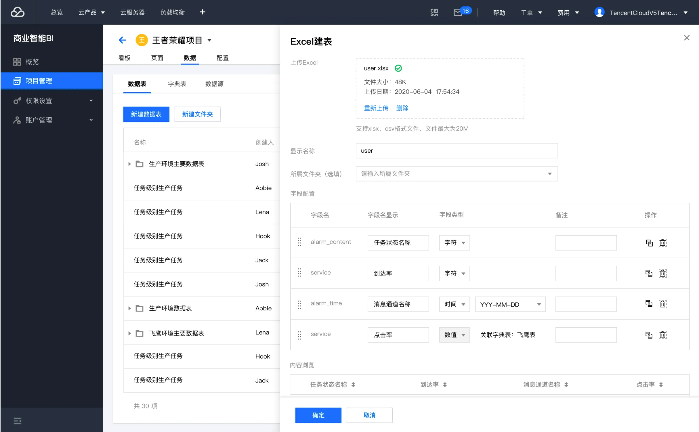 上传完成后,将解析出文件中的字段,根据实际情况设置各字段展示名、格式等,并可进行上传内容的预览(前10条)。