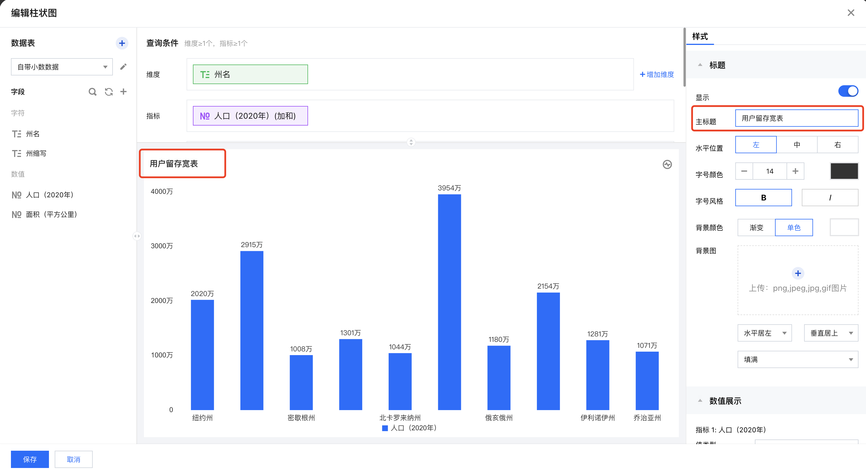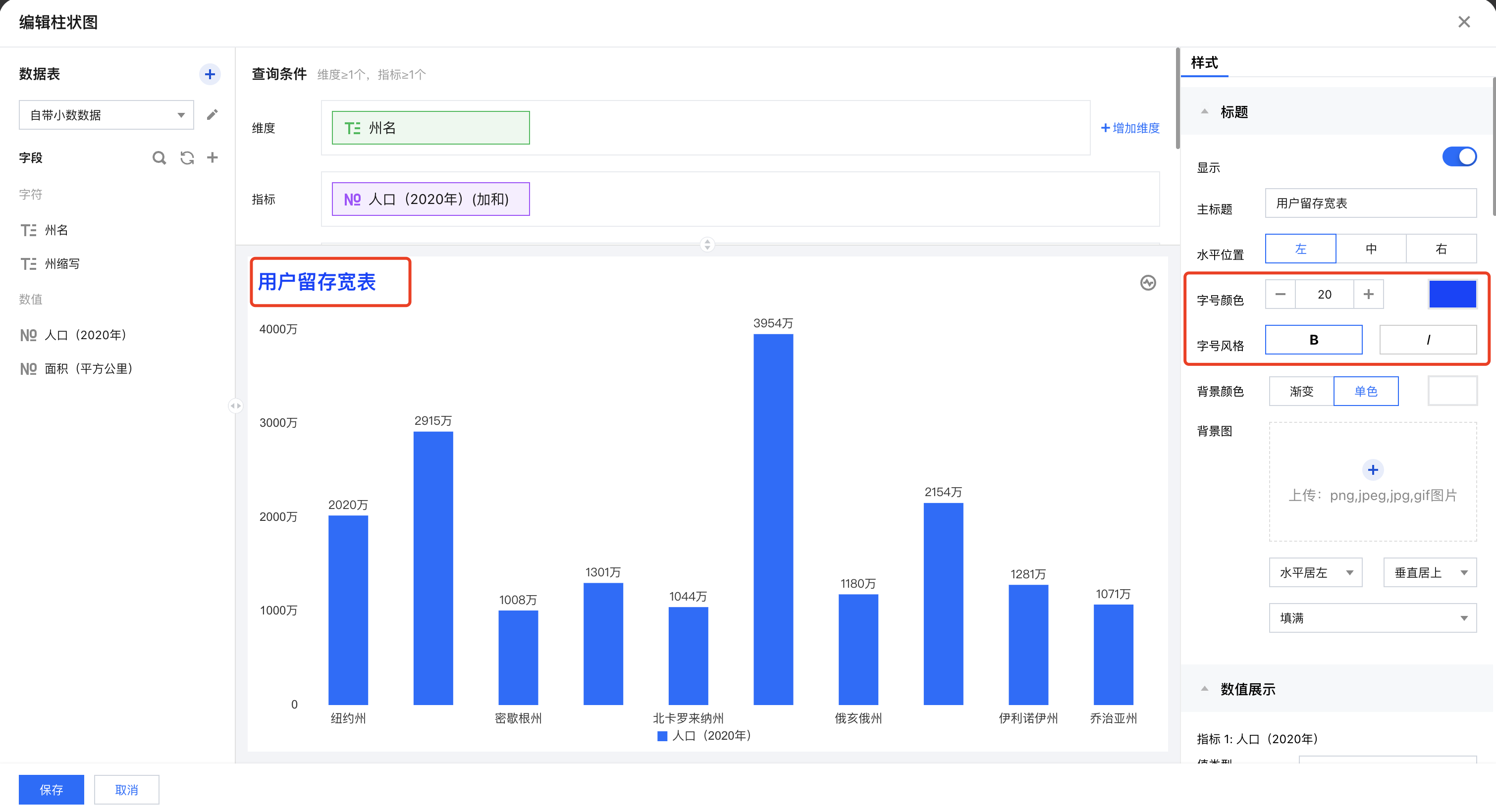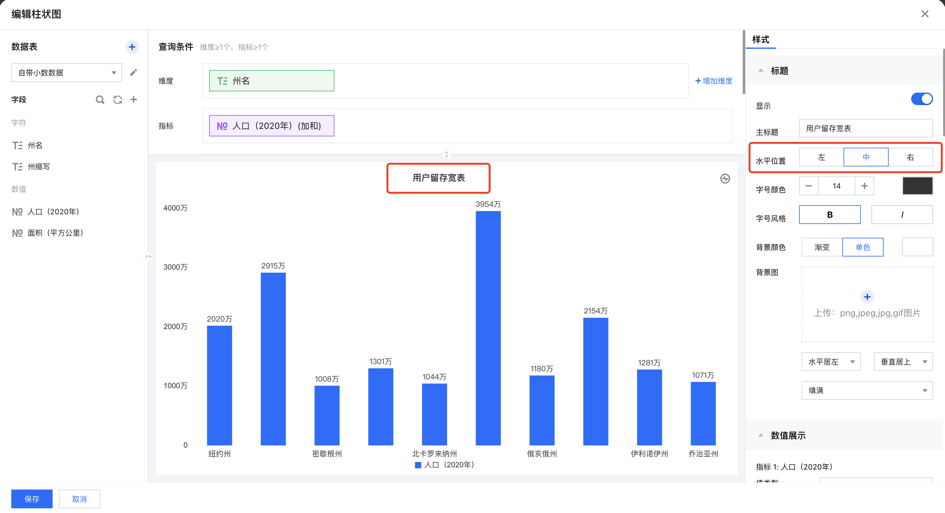 在组件标题中,您可以对组件标题、标题位置、标题文本样式、标题背景色、标题背景图进行相关配置。