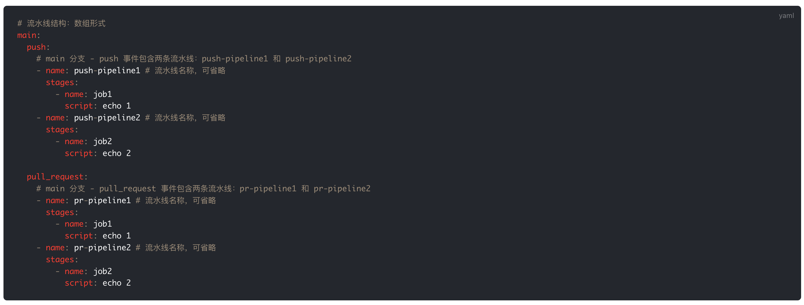 Pipeline As Code 可跨仓引用,借助 Git 进行管理和追溯。它采用声明式的流水线配置,该配置文件托管在代码仓库根目录下的 .cnb.yml 文件中。