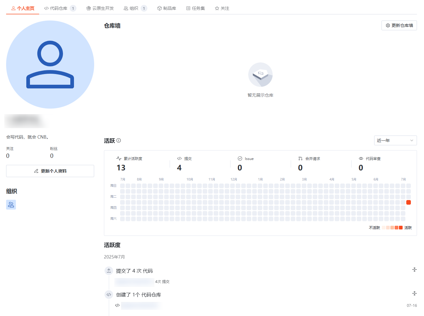 用户在个人中心可以查看自己参与的组织和仓库情况,以及对个人资料、邮箱信息、访问令牌等进行设置。