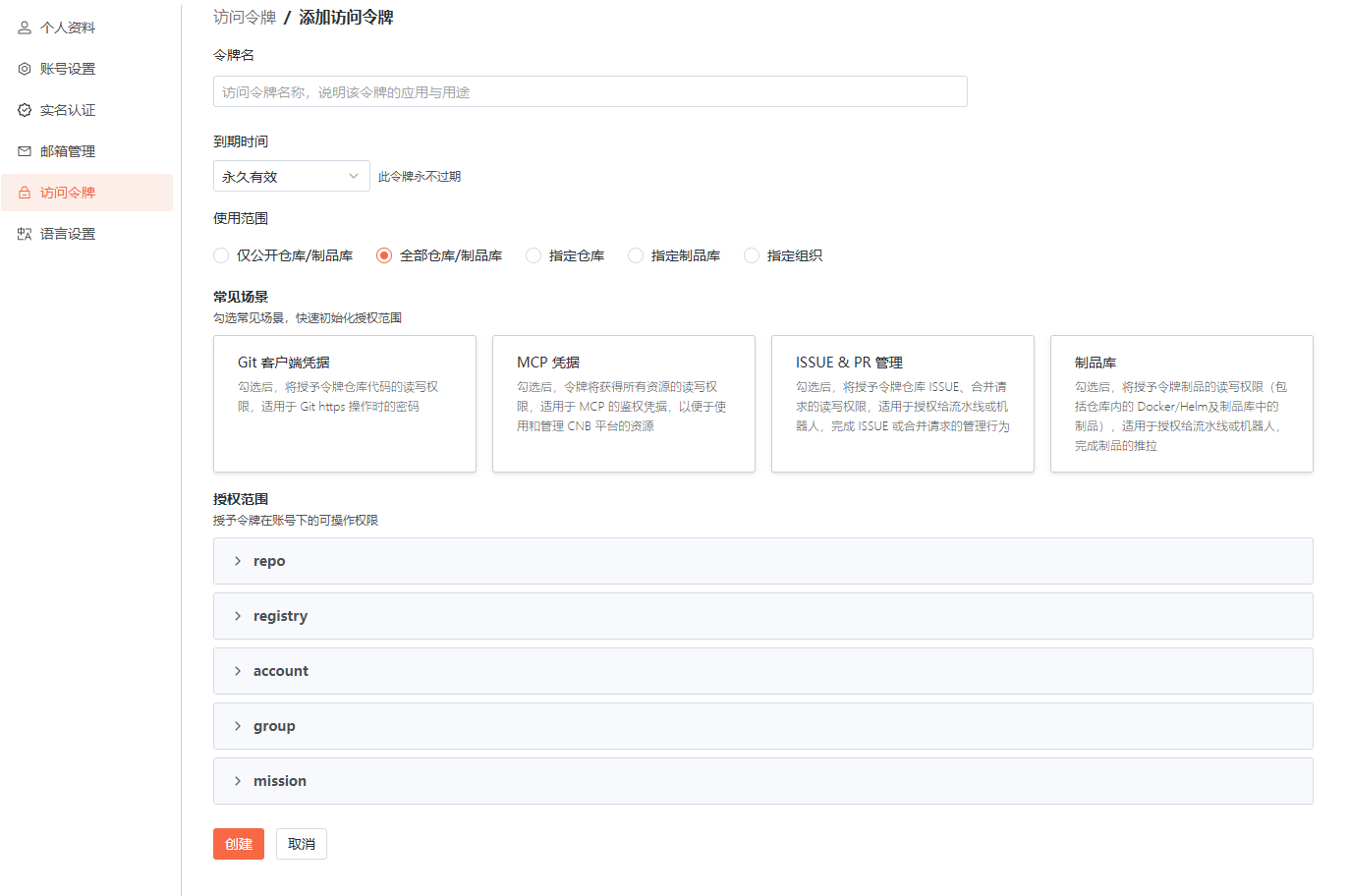 单击添加访问令牌,在创建时,可以通过常见场景快速初始化令牌授权范围,也可以在授权范围中逐个勾选。