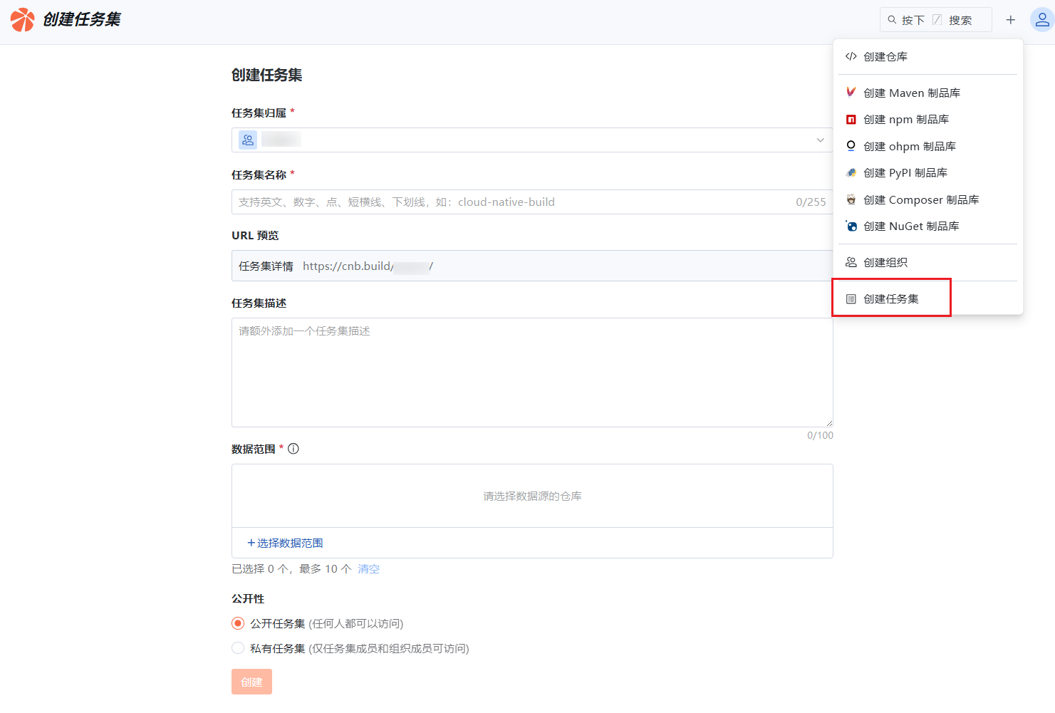 进入 CNB,单击右上角的“+”,选择创建任务集。 任务集名称:任务集的标识,也会组成任务集的访问路径。