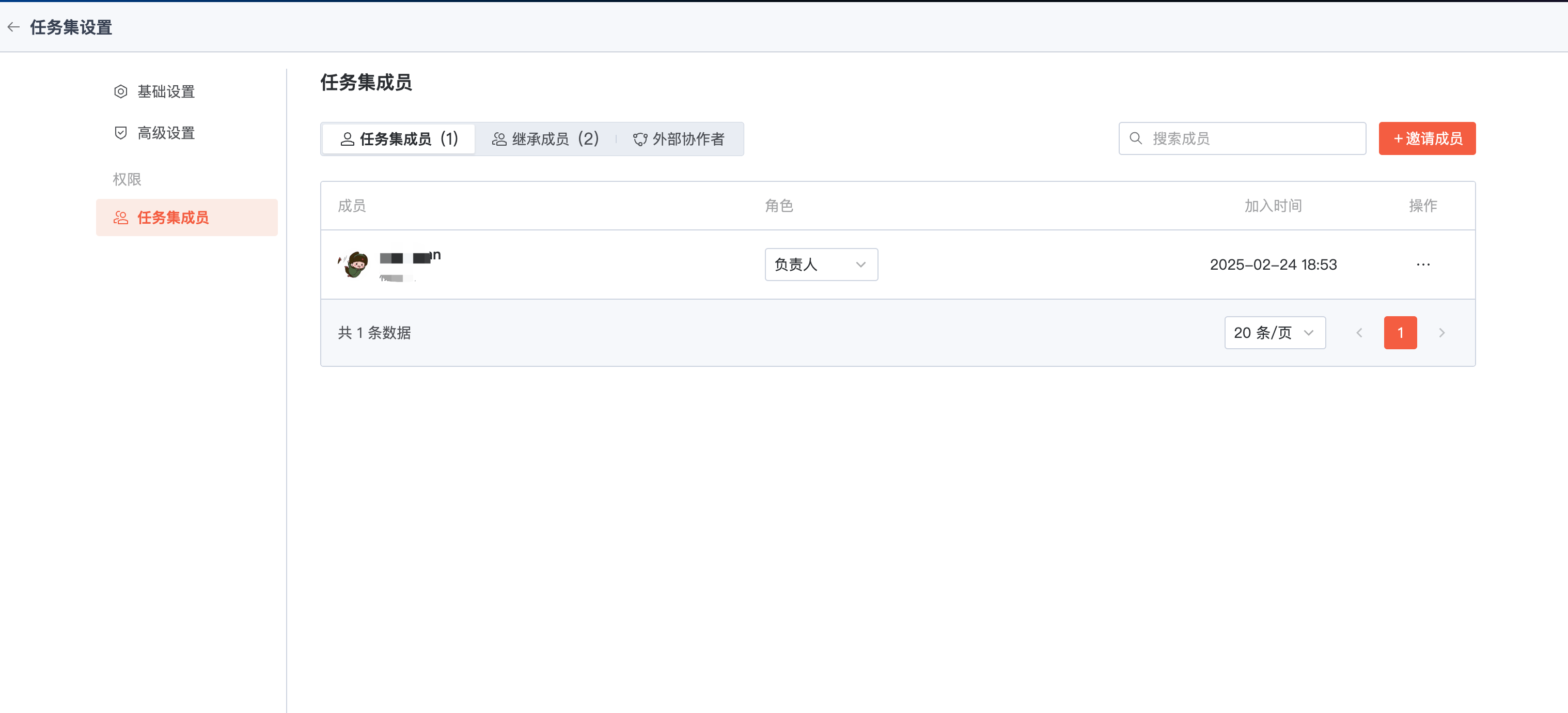 默认继承上级组织的所有成员权限关系。此外,还可单击邀请成员直接邀请成员加入当前任务集成为“任务集成员”或“外部协作者”。其中,外部协作者适用于一些临时参与协作的用户。