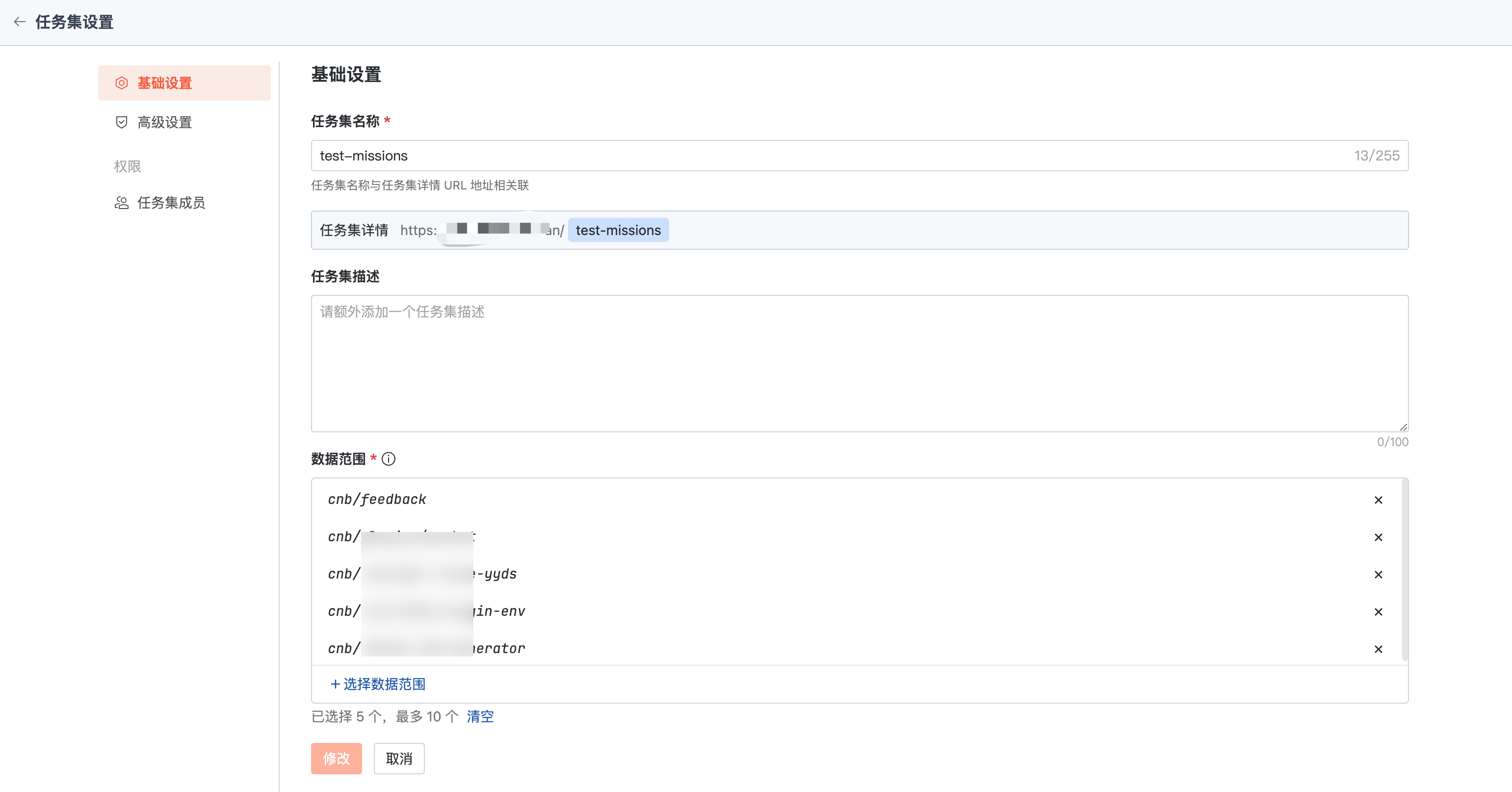 可以修改任务集名称和编辑任务集的数据范围等任务集的基础信息。