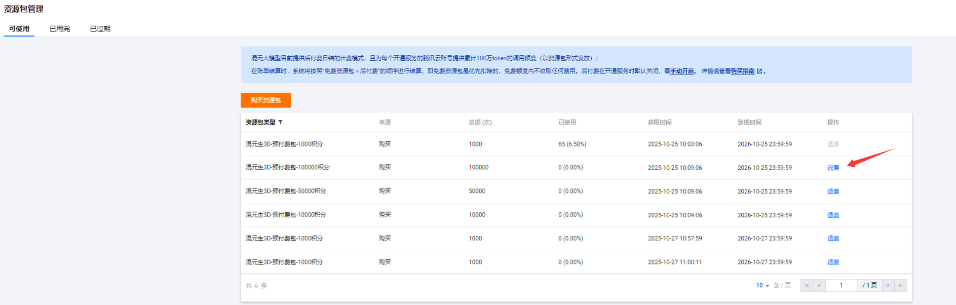 为了方便您使用腾讯混元生3D 服务,如果您购买的腾讯混元生3D 资源包未被使用,我们支持7天内(含7天)无理由退款。