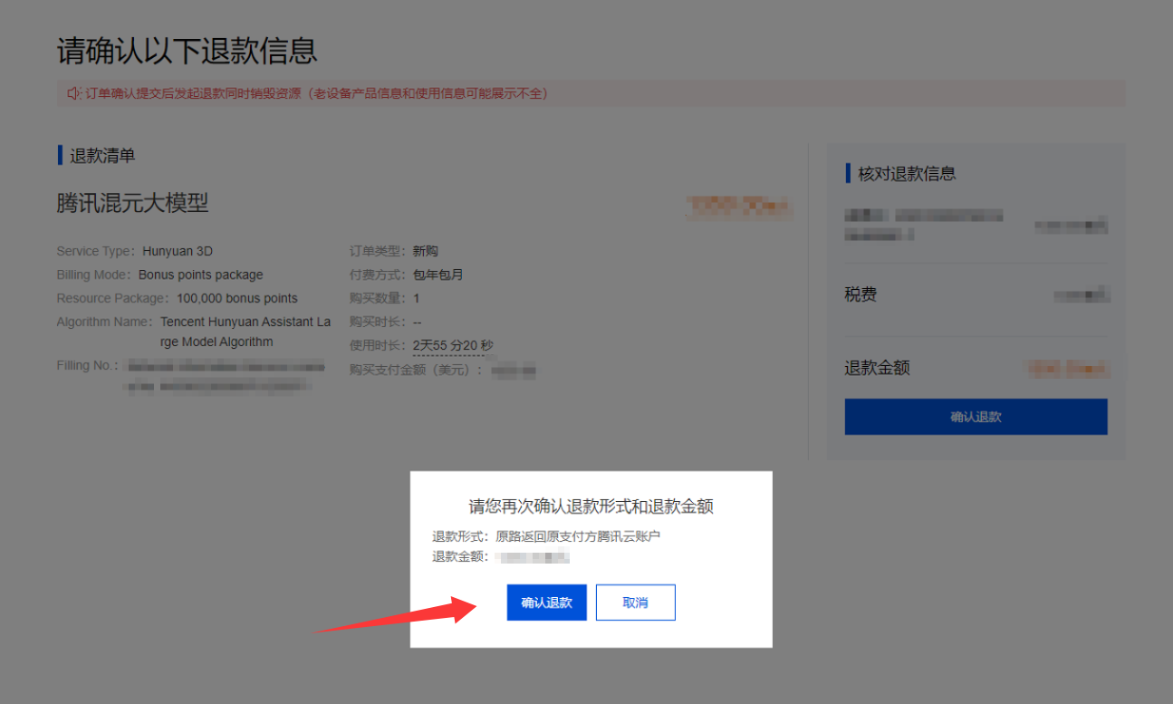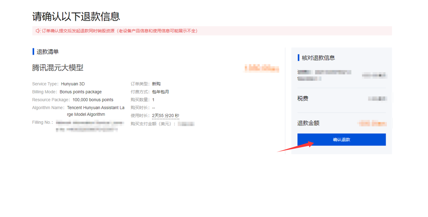 1. 登录腾讯混元大模型控制台,进入 资源包管理 页面,选择需要退款的资源包,单击退费。 2. 单击确认退款。