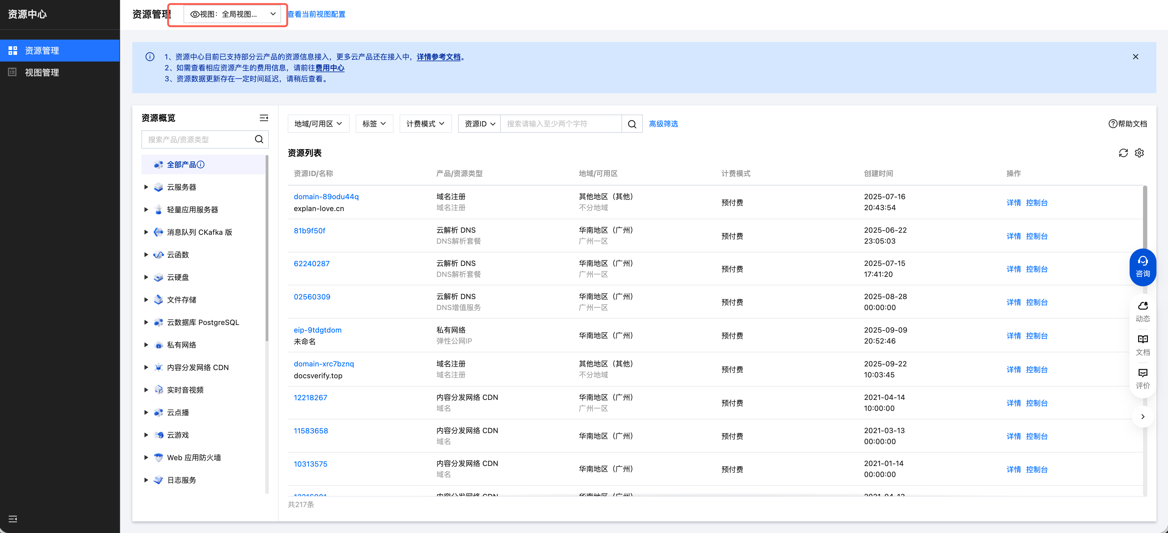 页,选择一个视图作为搜索数据源,视图由管理员创建。同时,资源中心也为所有用户提供了一个“全局视图(预设)”作为初始的默认视图使用。全局视图展示的是当前主账号下的所有资源。