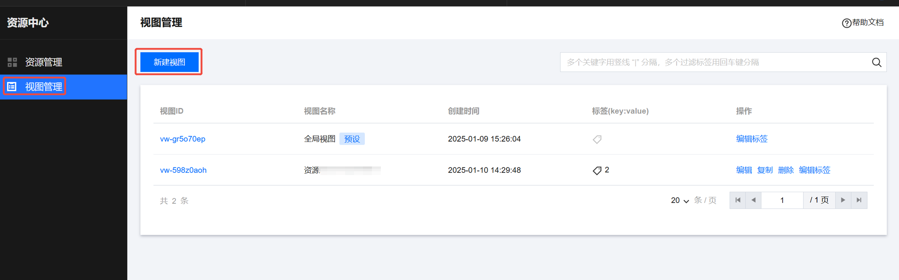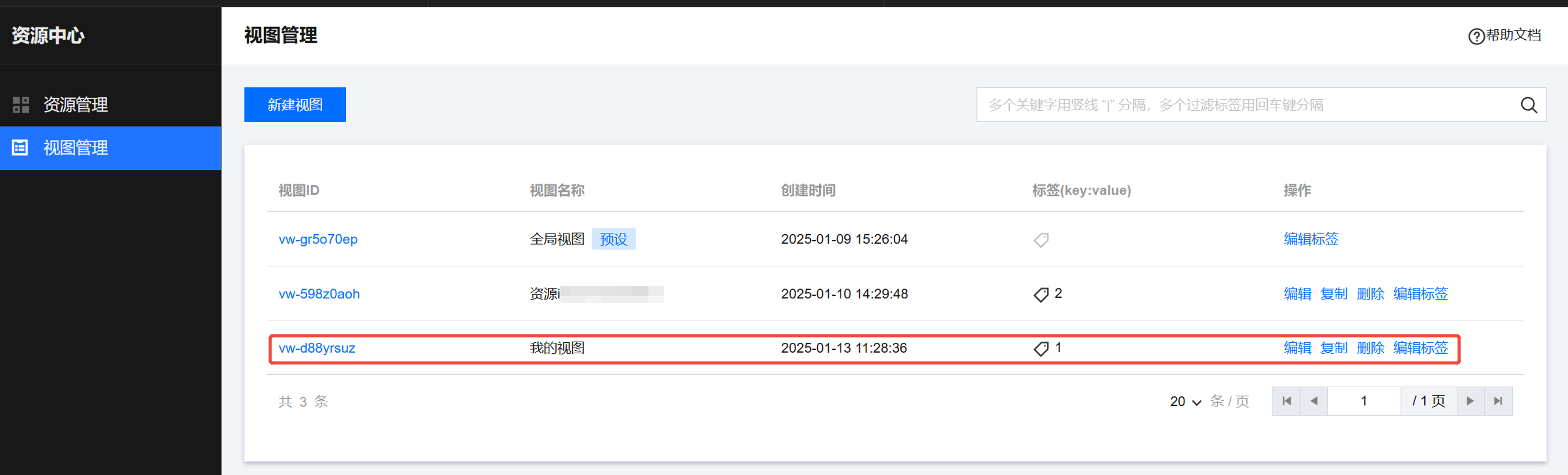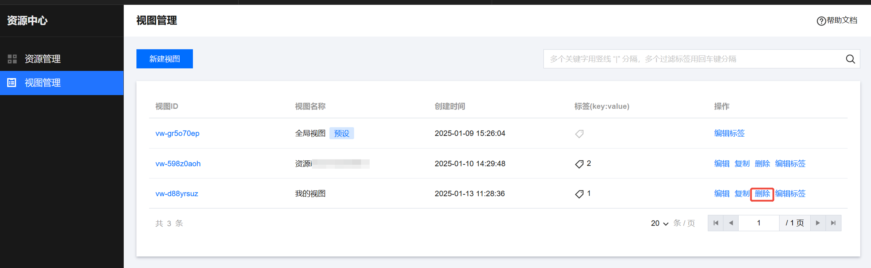 在 资源中心 页面,单击左侧视图管理,进入视图管理页面。 创建视图