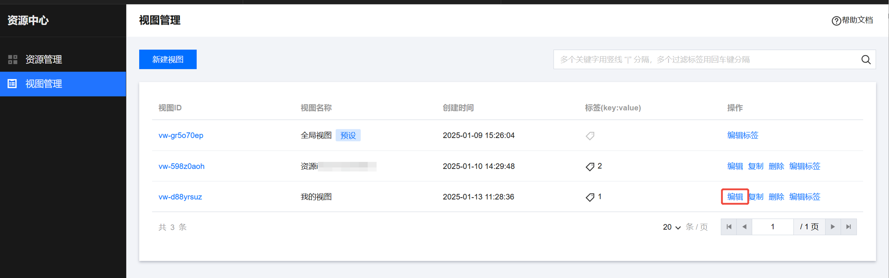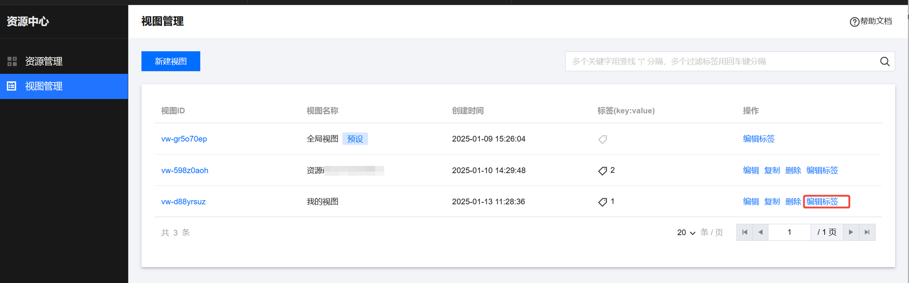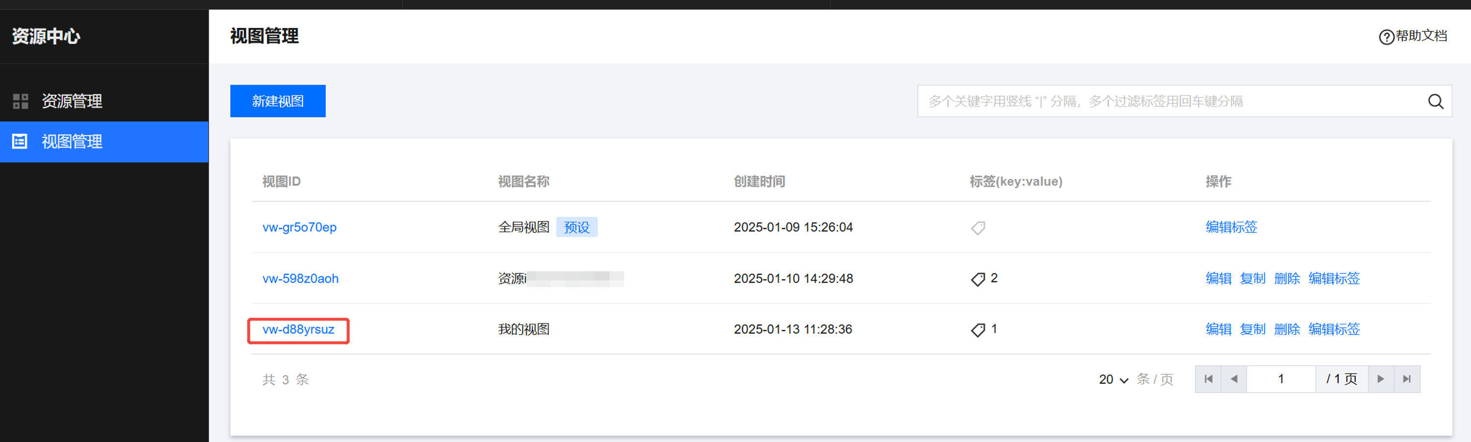 在 资源中心 页面,单击左侧视图管理,进入视图管理页面。 创建视图
