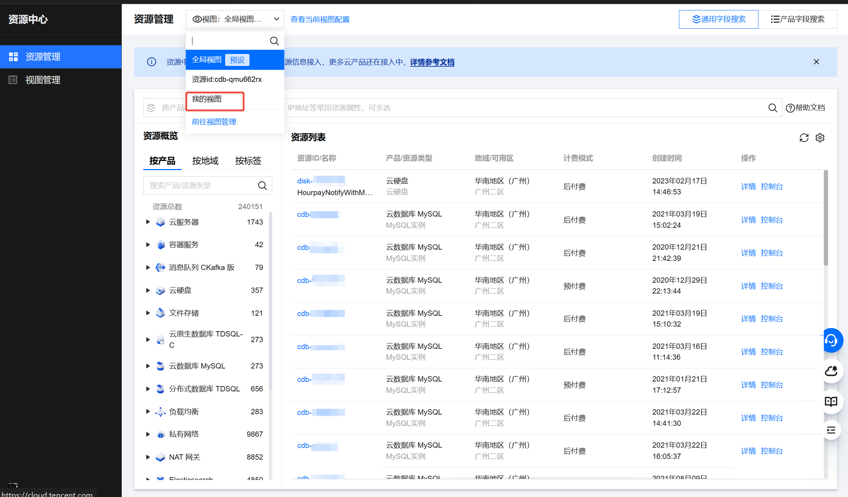 您也可以在资源管理页面的左上角选择需要查看的视图。您之前保存的视图筛选条件将会出现在搜索框的下方。