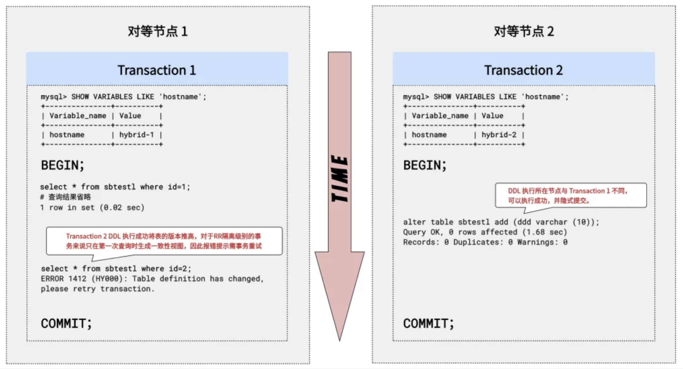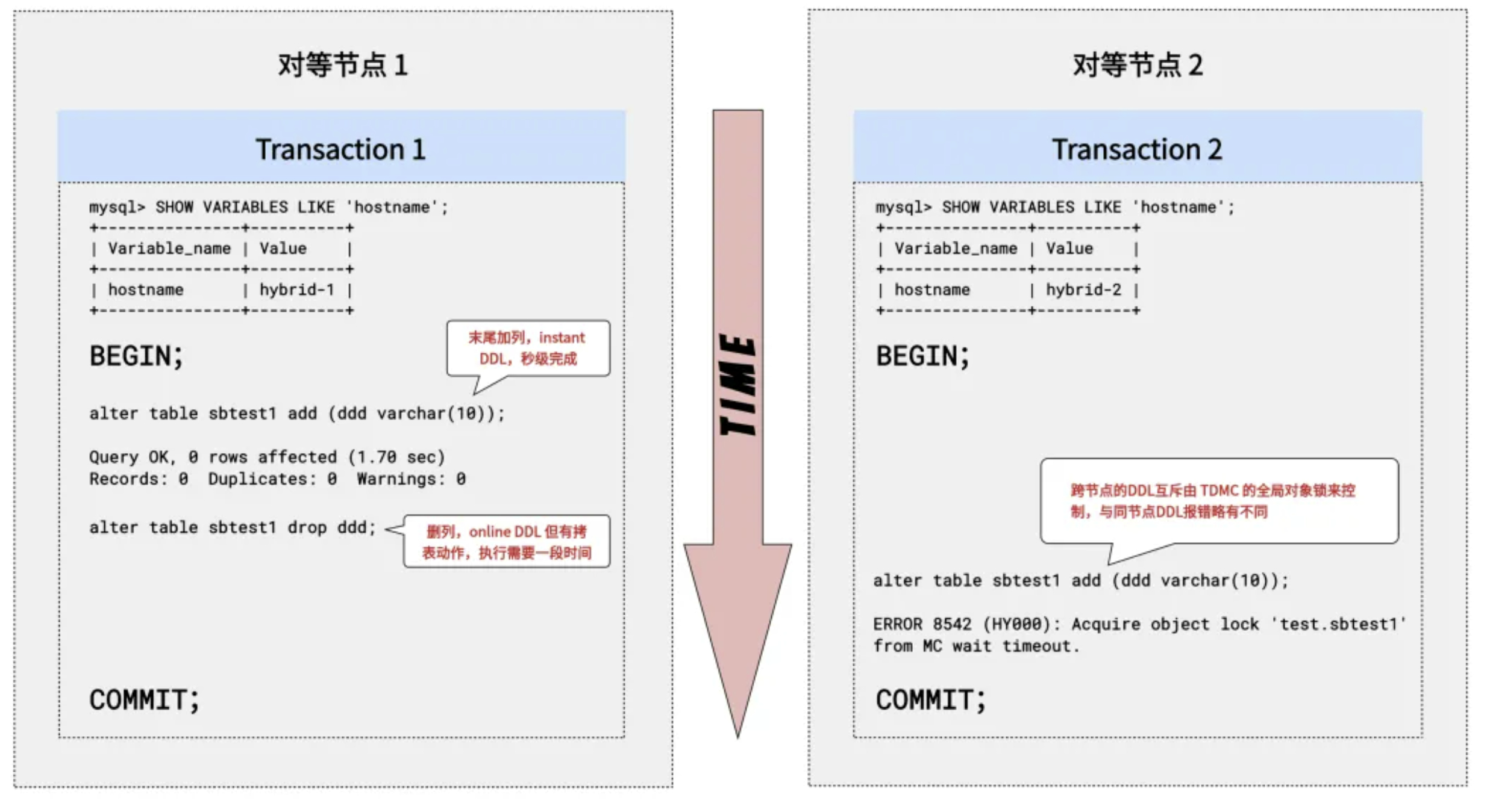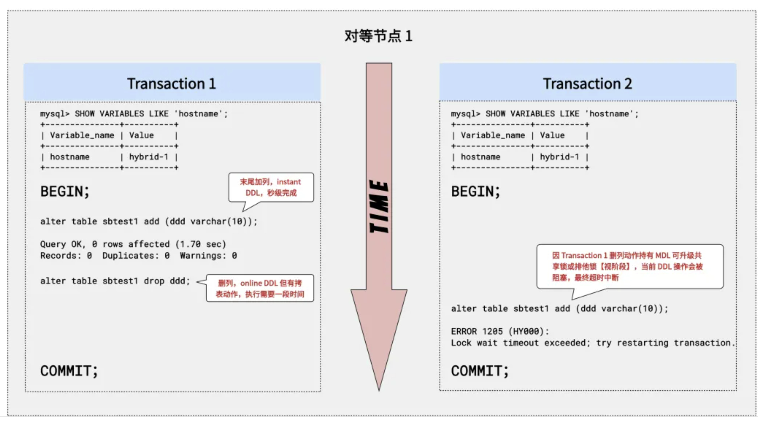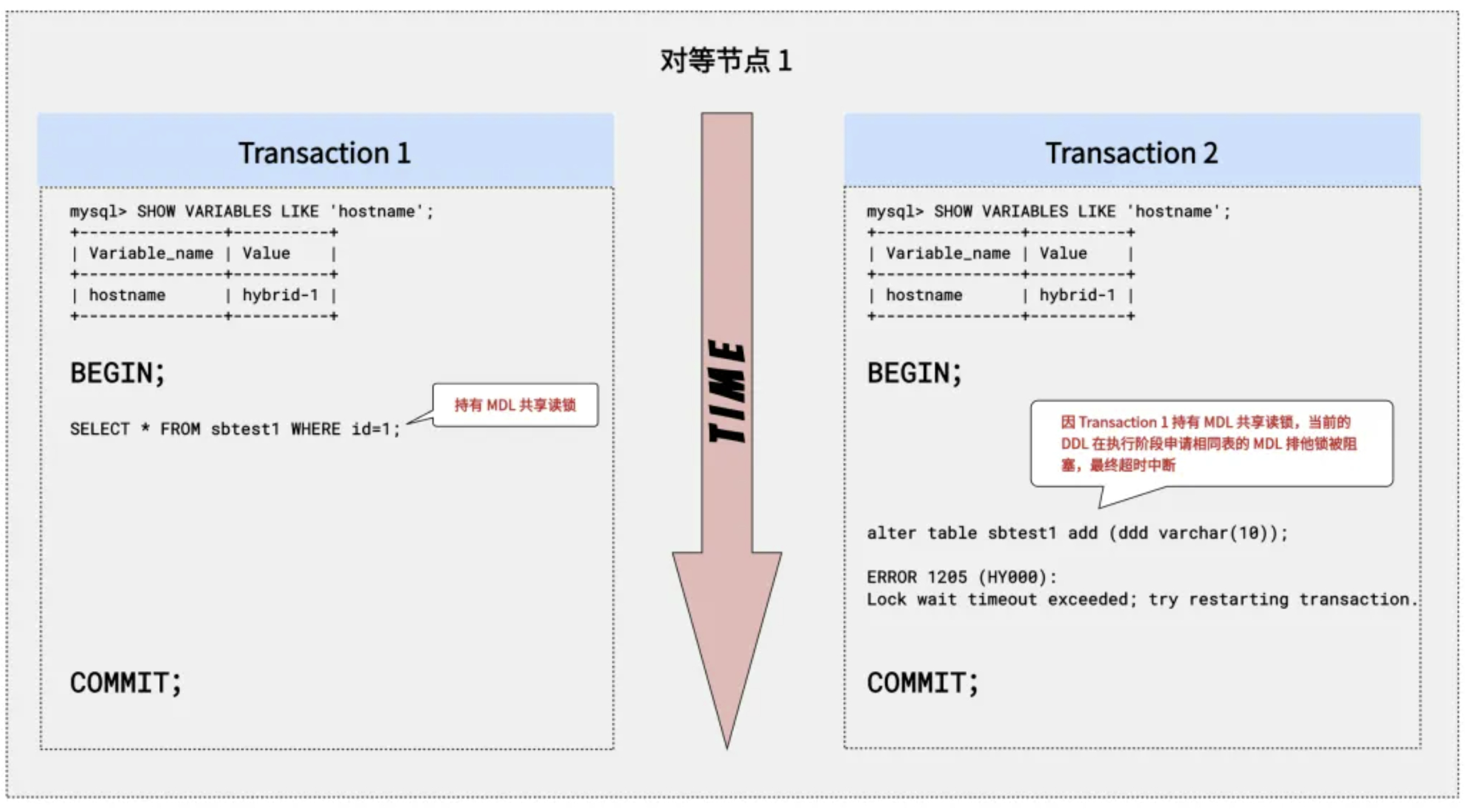 # 确认 session1、session2 连在同一节点# 如果不是连在同一节点上,ddl是可以执行成功的,参考“跨节点 DDL-DML 冲突”show variables like'hostname';#session1BEGIN;UPDATE sbtest1 SET k =0WHERE id =999;#session2ALTERTABLE sbtest1 ADDCOLUMN new_column VARCHAR(255);#查看 metadata_locks,可以看到:#第一行LOCK_STATUS=GRANTED的记录正是 session1,表示已获得 MDL 锁;#第二行LOCK_STATUS=PENDING的记录正是 session2,表示获取 MDL 锁被挂起。#需要在开头加上 broadcast HINT 指定在所有节点广播查询。/*#broadcast*/select*from performance_schema.metadata_locks where OBJECT_NAME='sbtest1' \\G***************************1.row***************************OBJECT_TYPE: TABLEOBJECT_SCHEMA: testOBJECT_NAME: sbtest1COLUMN_NAME: NULLOBJECT_INSTANCE_BEGIN: 140384374661472LOCK_TYPE: SHARED_WRITELOCK_DURATION: TRANSACTIONLOCK_STATUS: GRANTEDSOURCE: sql_parse.cc:6373OWNER_THREAD_ID: 4879164OWNER_EVENT_ID: 1***************************2.row***************************OBJECT_TYPE: TABLEOBJECT_SCHEMA: testOBJECT_NAME: sbtest1COLUMN_NAME: NULLOBJECT_INSTANCE_BEGIN: 140375267009376LOCK_TYPE: SHAREDLOCK_DURATION: EXPLICITLOCK_STATUS: PENDINGSOURCE: ddl_executer.cc:245OWNER_THREAD_ID: 4879122OWNER_EVENT_ID: 12rowsinset(0.02 sec)#当查询多次都发现 LOCK_STATUS: GRANTED 的会话一直没有变化时,可通过 OWNER_THREAD_ID 定位到持有锁的线程所对应的 SESSION ID,在确认该会话可安全终止后,先通过 KILL 命令结束该会话,再重新发起 DDL 操作。/*#broadcast*/select*from performance_schema.threads where THREAD_ID=4879164\\G***************************1.row***************************THREAD_ID: 4879164NAME: thread/sql/one_connectionTYPE: FOREGROUNDPROCESSLIST_ID: 2346946PROCESSLIST_USER: xxxxxPROCESSLIST_HOST: xxx.xxx.xxx.xxxPROCESSLIST_DB: testPROCESSLIST_COMMAND: SleepPROCESSLIST_TIME: 1330PROCESSLIST_STATE:PROCESSLIST_INFO:PARENT_THREAD_ID:ROLE:INSTRUMENTED: YESHISTORY: YESCONNECTION_TYPE: TCP/IPTHREAD_OS_ID: 45448RESOURCE_GROUP:SQLEngine_id: node-tdsql3-***-0021rowinset(0.02 sec)#KILL 持锁者(LOCK_STATUS: GRANTED 会话)#session1 被杀#session2ALTERTABLE sbtest1 ADDCOLUMN new_column VARCHAR(255);Query OK,0rows affected (1.67 sec)Records: 0 Duplicates: 0 Warnings: 0