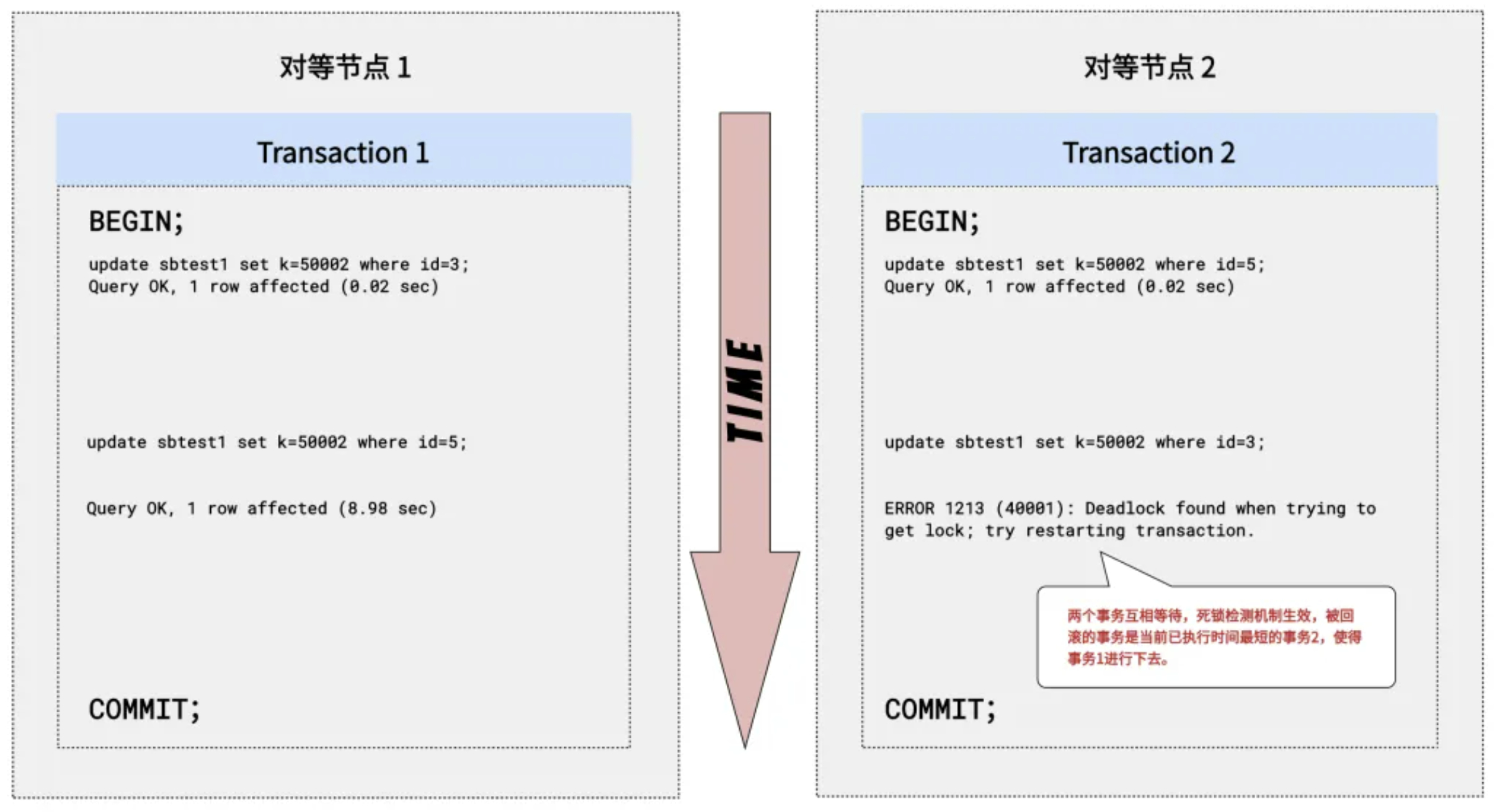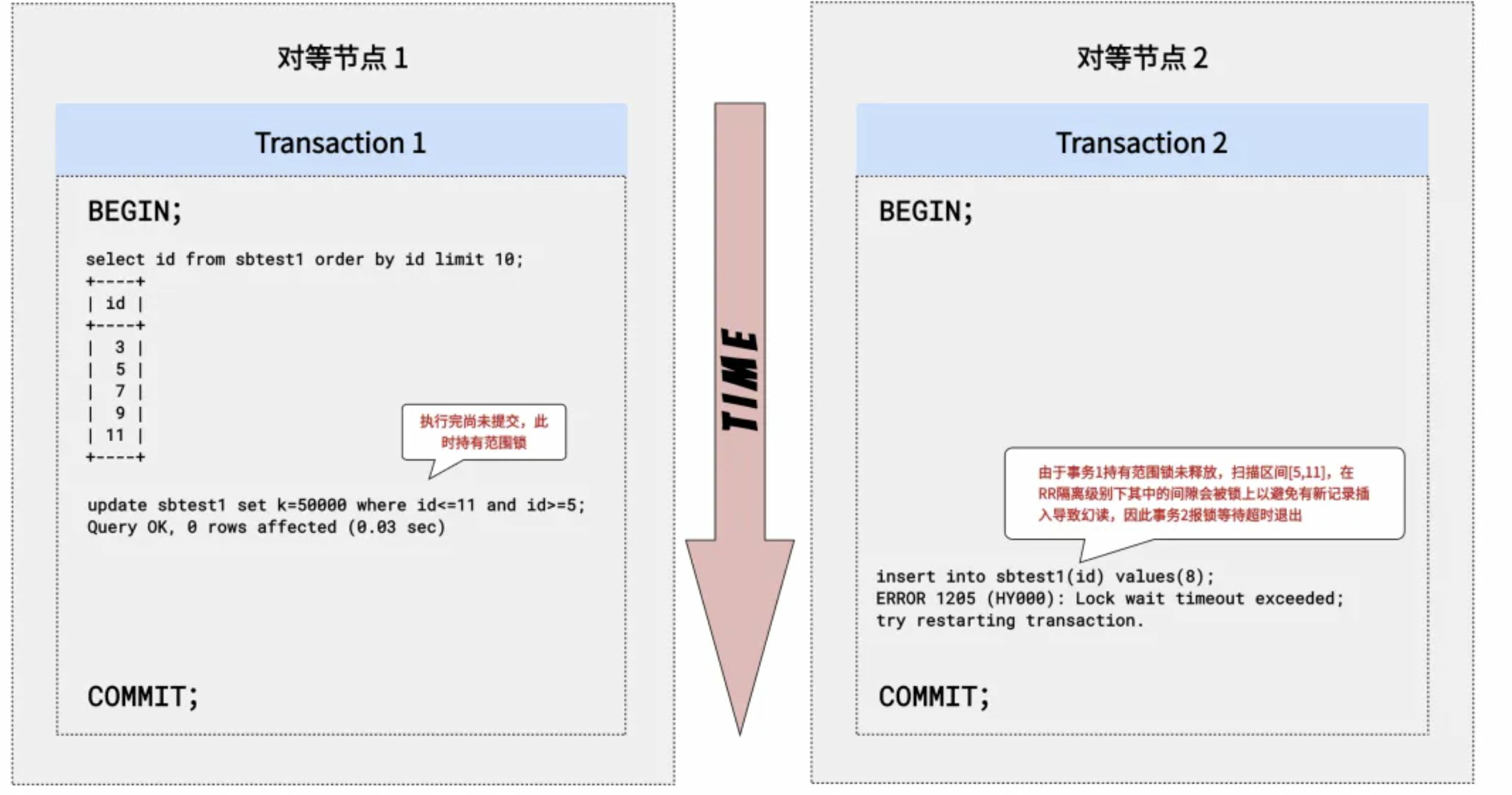 # 这里 session1、session2 无论是否连到同一节点,结果都是一样的;因为行锁是存储层的,两个会话发生行锁冲突,说明最终都访问了相同存储节点的主副本#session1SELECT id FROM sbtest1 ORDERBY id limit10;+----+| id |+----+|1||3||5||7||9||11||12||13||14||15|+----+10rowsinset(9.23 sec)BEGIN;UPDATE sbtest1 SET k=50000WHERE id<=11AND id>=5;#session2INSERTINTO sbtest1(id) VALUES(8);#查询当前节点上,持锁者(Lock Holder)的悲观锁信息。#先查询 data_lock_waits 表,获取 BLOCKING_ENGINE_LOCK_ID 字段【悲观锁ID】;再根据该字段值去查询 data_locks 表,获取持锁者信息。#TDStore 的 range lock 左闭右开,可以看到列 ENGINE_LOCK_ID 中显示为 [5,12) 区间。SELECT * FROM performance_schema.data_lock_waits\\G*************************** 1. row ***************************ENGINE: RocksDBREQUESTING_ENGINE_LOCK_ID: 29746913880309907_000082E380000008REQUESTING_NODE_ID: 3REQUESTING_NODE_NAME: node-tdsql3-***-003REQUESTING_ENGINE_TRANSACTION_ID: 29746913880309907REQUESTING_THREAD_ID: 428330REQUESTING_EVENT_ID: 0REQUESTING_OBJECT_INSTANCE_BEGIN: 140197932217896BLOCKING_ENGINE_LOCK_ID: 29746911900598447_[000082E380000005,000082E38000000C)BLOCKING_NODE_ID: 1BLOCKING_NODE_NAME: node-tdsql3-***-001BLOCKING_ENGINE_TRANSACTION_ID: 29746911900598447BLOCKING_THREAD_ID: 592422BLOCKING_EVENT_ID: 0BLOCKING_OBJECT_INSTANCE_BEGIN: 140197201734928TINDEX_ID: 33507DATA_SPACE_TYPE: DATA_SPACE_TYPE_USERREPLICATION_GROUP_ID: 868437KEY_RANGE_REGION_ID: 41824091 row in set (0.03 sec)SELECT data_locks.* FROM performance_schema.data_locks WHERE engine_lock_id='29746911900598447_[000082E380000005,000082E38000000C)'\\G*************************** 1. row ***************************ENGINE: RocksDBENGINE_LOCK_ID: 29746911900598447_[000082E380000005,000082E38000000C)ENGINE_TRANSACTION_ID: 29746911900598447THREAD_ID: 592422EVENT_ID: NULLOBJECT_SCHEMA:OBJECT_NAME:PARTITION_NAME: NULLSUBPARTITION_NAME: NULLINDEX_NAME: NULLOBJECT_INSTANCE_BEGIN: 140197201734928LOCK_TYPE: PRE_RANGELOCK_MODE: WriteLOCK_STATUS: GRANTEDLOCK_DATA: NULLSTART_KEY: 000082E380000005END_KEY: 000082E38000000CEXCLUDE_START_KEY: 0BLOCKING_TRANSACTION_NUM: 1BLOCKING_CHECK_READ_TRANSACTION_NUM: 0READ_LOCKED_NUM: 0TINDEX_ID: 33507DATA_SPACE_TYPE: DATA_SPACE_TYPE_USERREPLICATION_GROUP_ID: 868437KEY_RANGE_REGION_ID: 4182409PROCESSLIST_ID: 1693568NODE_ID: 1NODE_NAME: node-tdsql3-***-0011 row in set (0.03 sec)# 查看持锁者(Lock Holder)的会话信息。# 说明:data_locks 表中的 THREAD_ID 为 Performance Schema 的内部线程 ID。如需查询对应的会话信息,请使用 PROCESSLIST_ID 字段关联 information_schema.processlist 表。此外,NODE_ID 和 NODE_NAME 字段可用于定位该事务所在的 SQLEngine 节点。select * from information_schema.processlist where id=1093359\\G***************************1.row***************************ID: 1093359USER: tdsql_adminHOST: xxx.xxx.xxx.xxx:35956DB: testCOMMAND: SleepTIME: 946STATE: NULLINFO: NULLTIME_MS: 945727ROWS_SENT: 0ROWS_EXAMINED: 41rowinset(0.12 sec)#KILL 持锁者(Lock Holder)后,阻塞会话执行成功。#session1 被杀#session2INSERTINTO sbtest1(id)VALUES(8);Query OK,1row affected (43.78 sec)#注意:高并发场景下,可能等待会话(Lock Waiter)队列比较长,这样可能又会再次出现持锁者(Lock Holder),可能需要多杀几次。