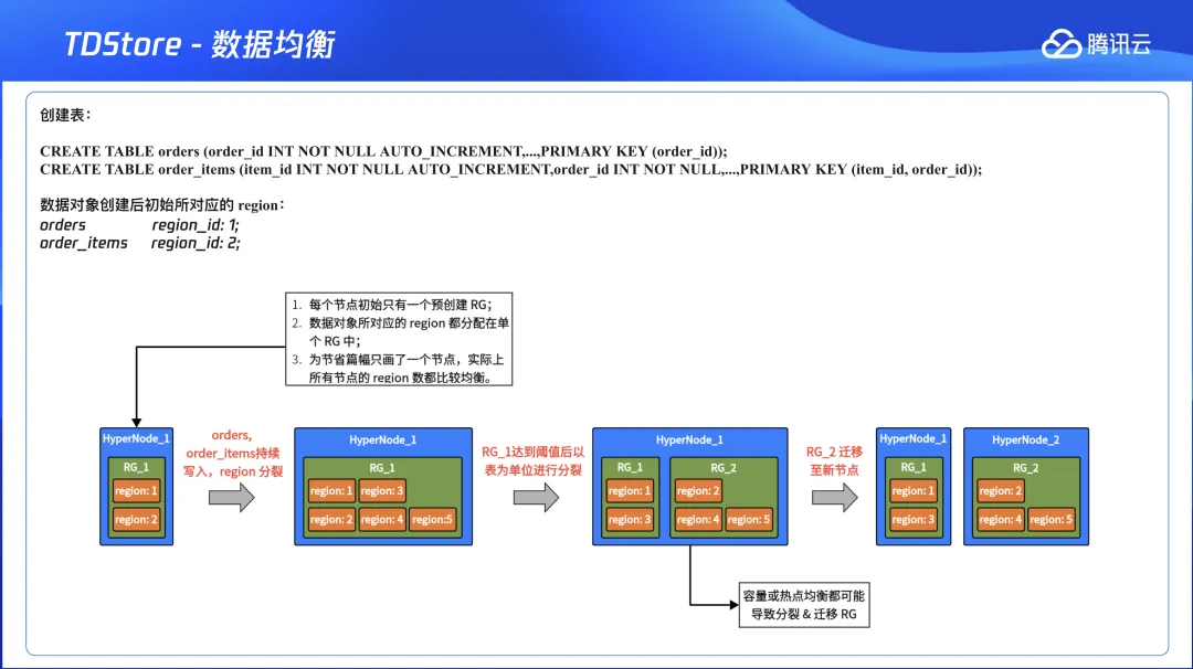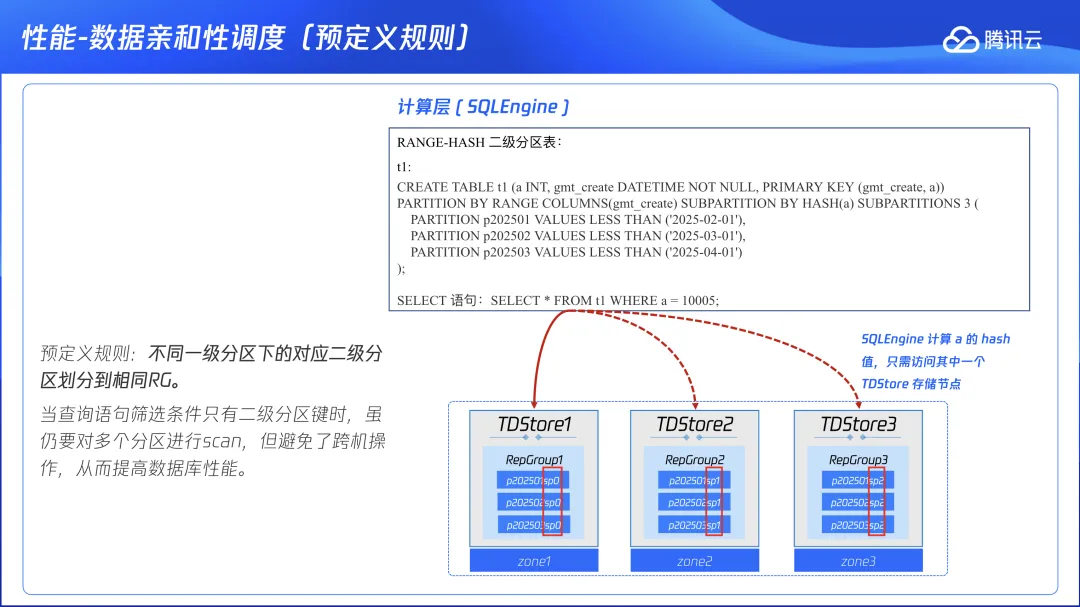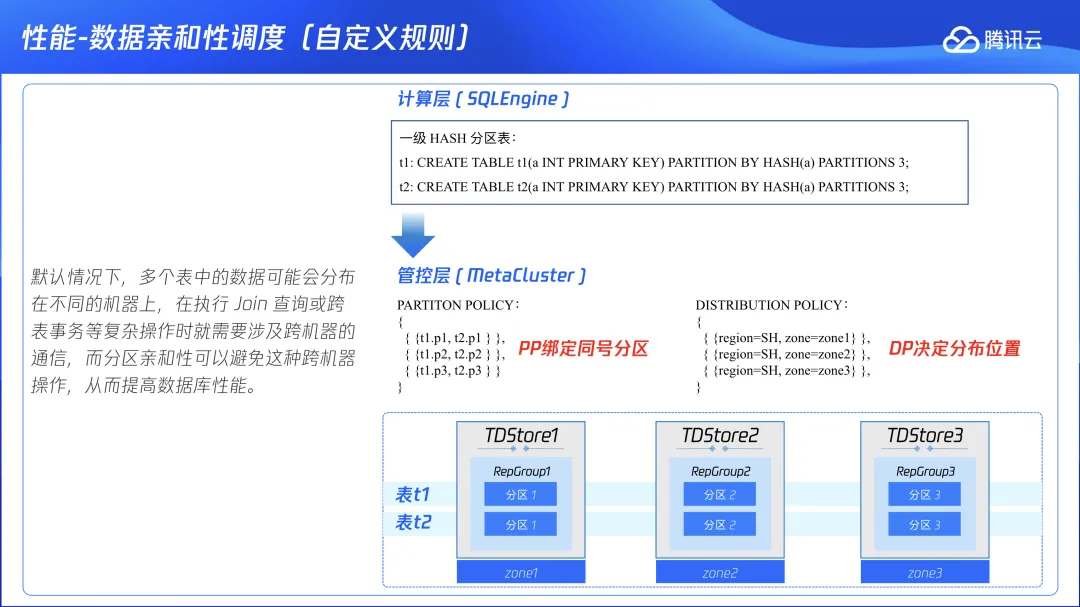 --当前同号分区都在相同节点上:+--------------+----------------+-------------+----------------+--------------------------+---------+---------+| rep_group_id | data_obj_name | schema_name | data_obj_name | leader_node_name | size | key_num |+--------------+----------------+-------------+----------------+--------------------------+---------+---------+|868437| orders.p1 | klose | orders.p1 | node-tdsql3-c1528b96-002|3909181|333334||868437| order_items.p1 | klose | order_items.p1 | node-tdsql3-c1528b96-002|7708701|666508||869169| orders.p0 | klose | orders.p0 | node-tdsql3-c1528b96-001|3792790|333333||869169| order_items.p0 | klose | order_items.p0 | node-tdsql3-c1528b96-001|7575671|666757||869736| orders.p2 | klose | orders.p2 | node-tdsql3-c1528b96-003|3782701|333333||869736| order_items.p2 | klose | order_items.p2 | node-tdsql3-c1528b96-003|7550956|666477|+--------------+----------------+-------------+----------------+--------------------------+---------+---------+--模拟先前版本 TDSQL Boundless 中默认没有分区亲和性的状态,将 RG 分裂,并进行打散:ALTER INSTANCE SPLIT RG 868437BY'table';ALTER INSTANCE SPLIT RG 869169BY'table';ALTER INSTANCE SPLIT RG 869736BY'table';ALTER INSTANCE TRANSFER LEADER RG 869169TO'node-tdsql3-c1528b96-002';ALTER INSTANCE TRANSFER LEADER RG 868437TO'node-tdsql3-c1528b96-003';ALTER INSTANCE TRANSFER LEADER RG 869736TO'node-tdsql3-c1528b96-001';ALTER INSTANCE TRANSFER LEADER RG 72133681TO'node-tdsql3-c1528b96-001';--调整 TDMC 参数,避免预创建 RG leader 回切:将 TDMC 管控参数 check-primary-rep-group-enabled 设置为 0。--查看数据分布,确认同号分区当前已不再相同对等节点上:SELECTb.rep_group_id, a.data_obj_name, a.schema_name, a.data_obj_name, c.leader_node_name,SUM(b.region_stats_approximate_size)AS size,SUM(b.region_stats_approximate_keys)AS key_numFROMINFORMATION_SCHEMA.META_CLUSTER_DATA_OBJECTS a,INFORMATION_SCHEMA.META_CLUSTER_REGIONS b,INFORMATION_SCHEMA.META_CLUSTER_RGS cWHEREa.data_obj_id = b.data_obj_idand b.rep_group_id = c.rep_group_idand a.data_obj_type notlike'%index%'and a.data_obj_type notlike'%AUTOINC%'and a.schema_name ='klose'and data_obj_name notlike'%bak%'GROUPBYb.rep_group_id, a.schema_name, a.data_obj_nameORDERBY1,2,3;+--------------+----------------+-------------+----------------+--------------------------+---------+---------+| rep_group_id | data_obj_name | schema_name | data_obj_name | leader_node_name | size | key_num |+--------------+----------------+-------------+----------------+--------------------------+---------+---------+|869736| orders.p2 | klose | orders.p2 | node-tdsql3-c1528b96-001|3782701|333333||72133681| order_items.p0 | klose | order_items.p0 | node-tdsql3-c1528b96-001|7575671|666757||869169| orders.p0 | klose | orders.p0 | node-tdsql3-c1528b96-002|3792790|333333||72132949| order_items.p1 | klose | order_items.p1 | node-tdsql3-c1528b96-002|7708701|666508||868437| orders.p1 | klose | orders.p1 | node-tdsql3-c1528b96-003|3909181|333334||72134504| order_items.p2 | klose | order_items.p2 | node-tdsql3-c1528b96-003|7550956|666477|+--------------+----------------+-------------+----------------+--------------------------+---------+---------+--再次执行关联查询,由于现在同号分区全都不在一个对等节点上,orders 表中每一行记录到 order_items 表中进行索引匹配都要走 RPC 调用,叠加三可用区之间 1-3ms 左右的延迟,预期执行效率会大幅下降:SELECT COUNT(*) FROM orders a JOIN order_items b ON a.order_id=b.order_id;
