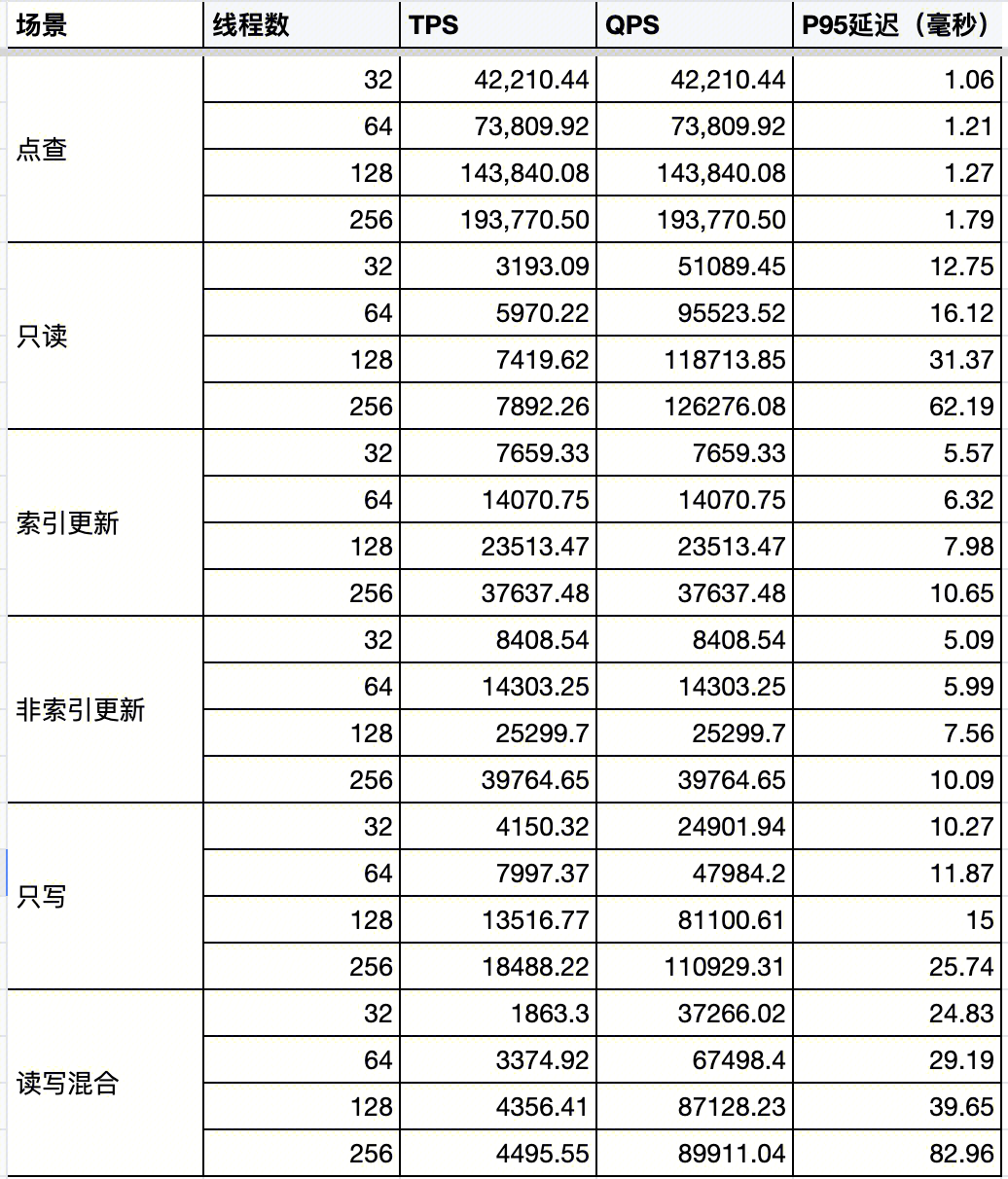 下表展示了:3节点,16Core CPU / 32GB Memory / 增强型 SSD 云硬盘。32张表,每张表一千万条记录的 Sysbench 性能数据。