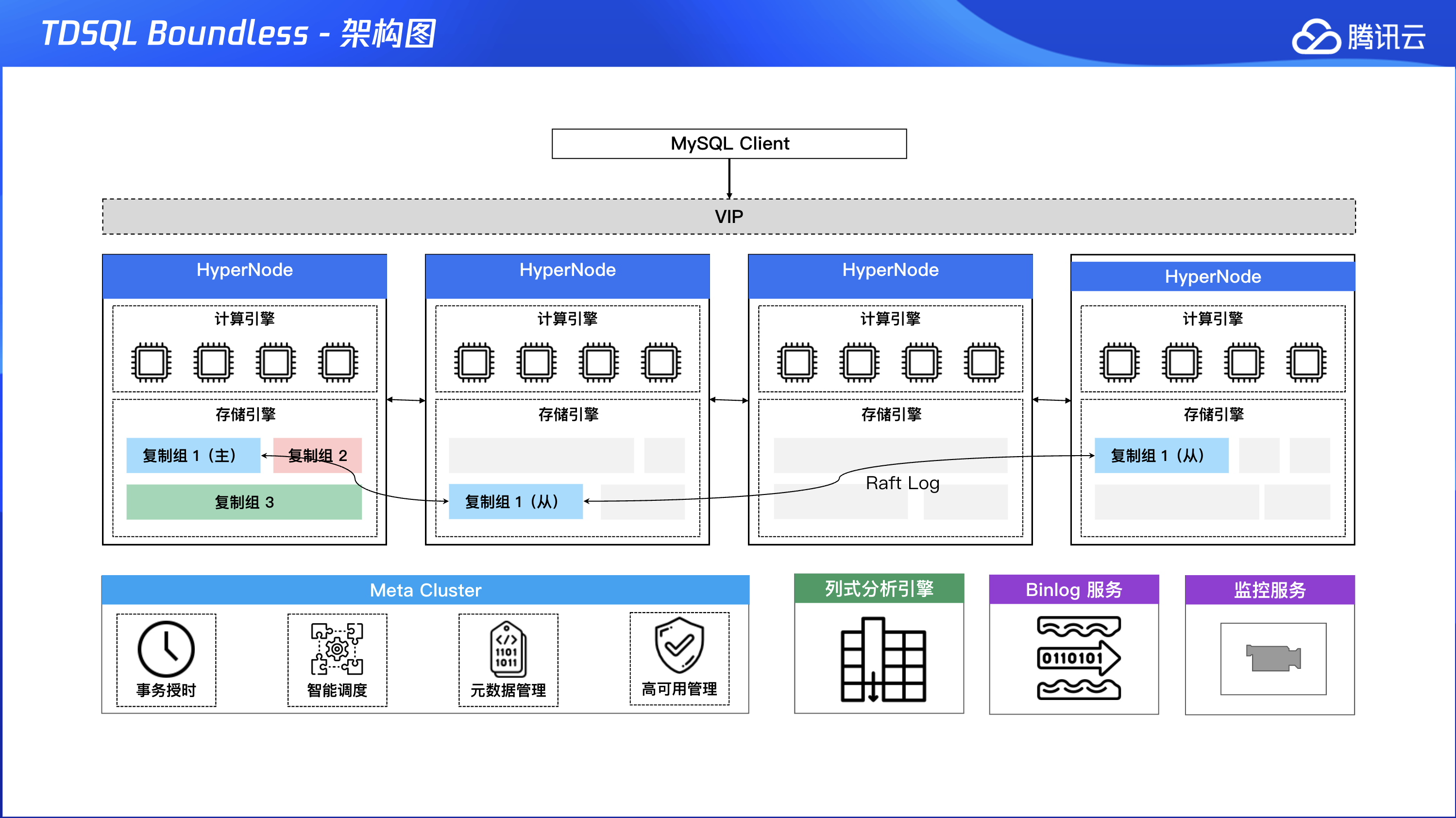 和传统 MySQL 主从复制不一样,TDSQL Boundless 采用更小的存储管理单位 RG (replica group,复制组)。每个 RG 使用 Raft 协议保证副本的一致性,每个 RG 的 Leader 可以分布到实例的任意节点上,因此,TDStore 的任意节点都可以承载读写的请求,从而可以更充分地使用所有节点的资源。