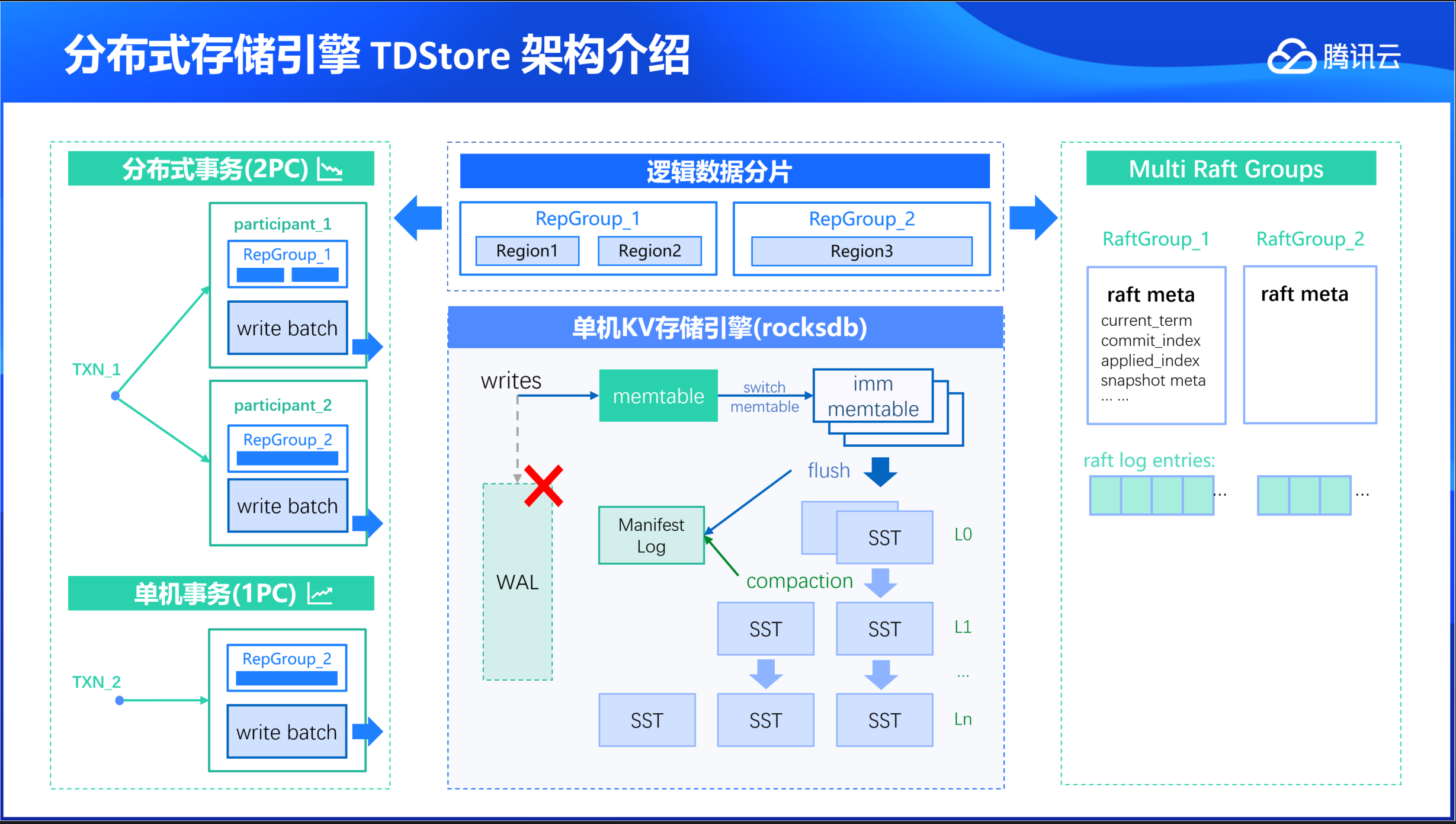 TDSQL Boundless 的存储引擎为 TDStore。TDStore 是一款分布式存储引擎,它在 RocksDB 基础上,上层构建了数据分片模块、分布式事务模块,下层增加了 Raft 共识协议模块,把一个单机的存储 KV 引擎改造成了支持高扩展、高可用、分布式事务、数据均衡调度、多副本强一致的分布式 KV 存储引擎。