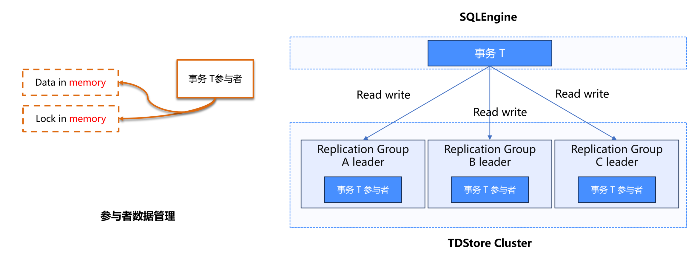 参与者管理机制:以复制组(Replication Group)为基本单位管理事务参与者。当事务需要访问特定复制组数据时,自动创建对应的参与者上下文。SQLEngine 的一个事务单元,访问 TDStore 集群上的多个参与者,每个参与者管理一个 Replication Group 的数据。