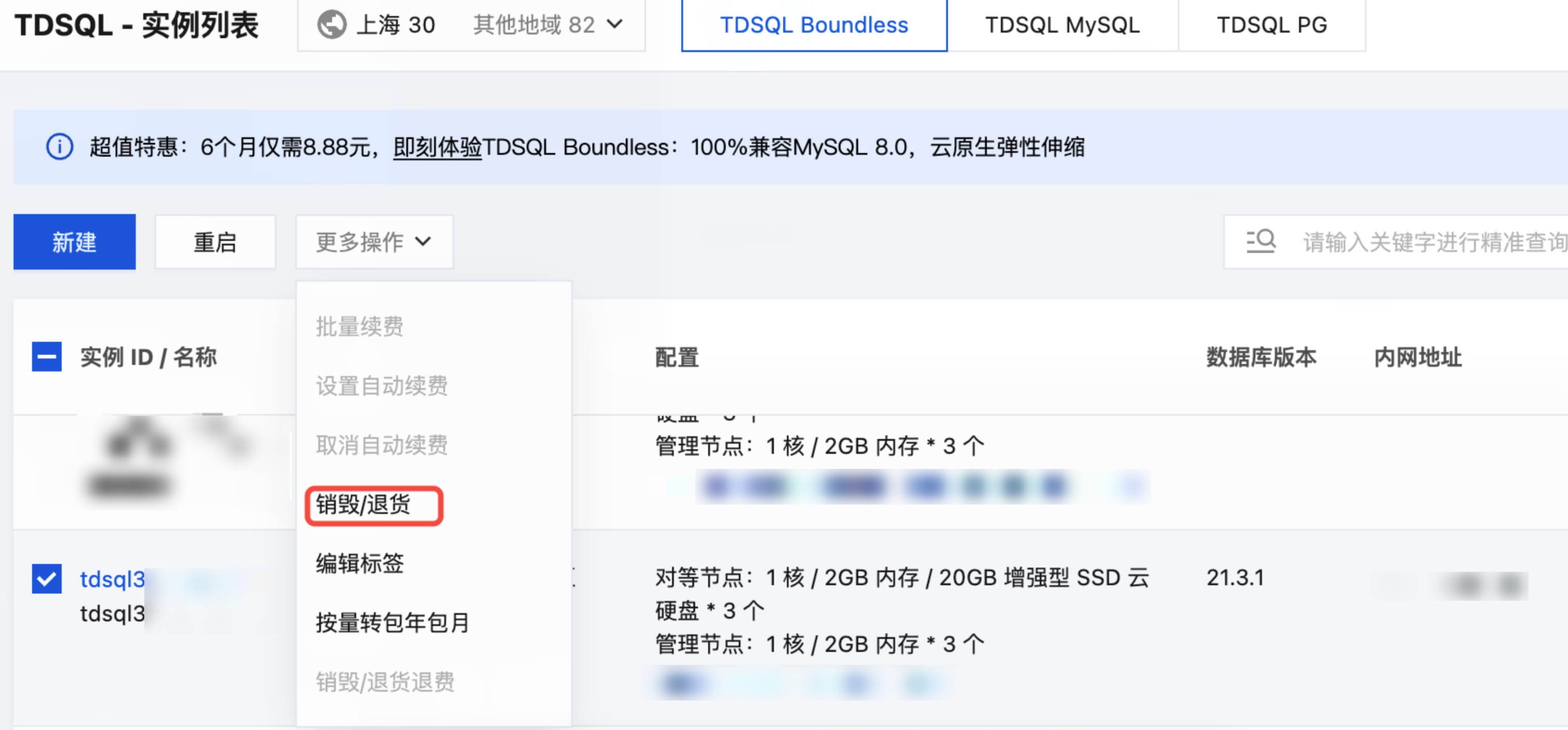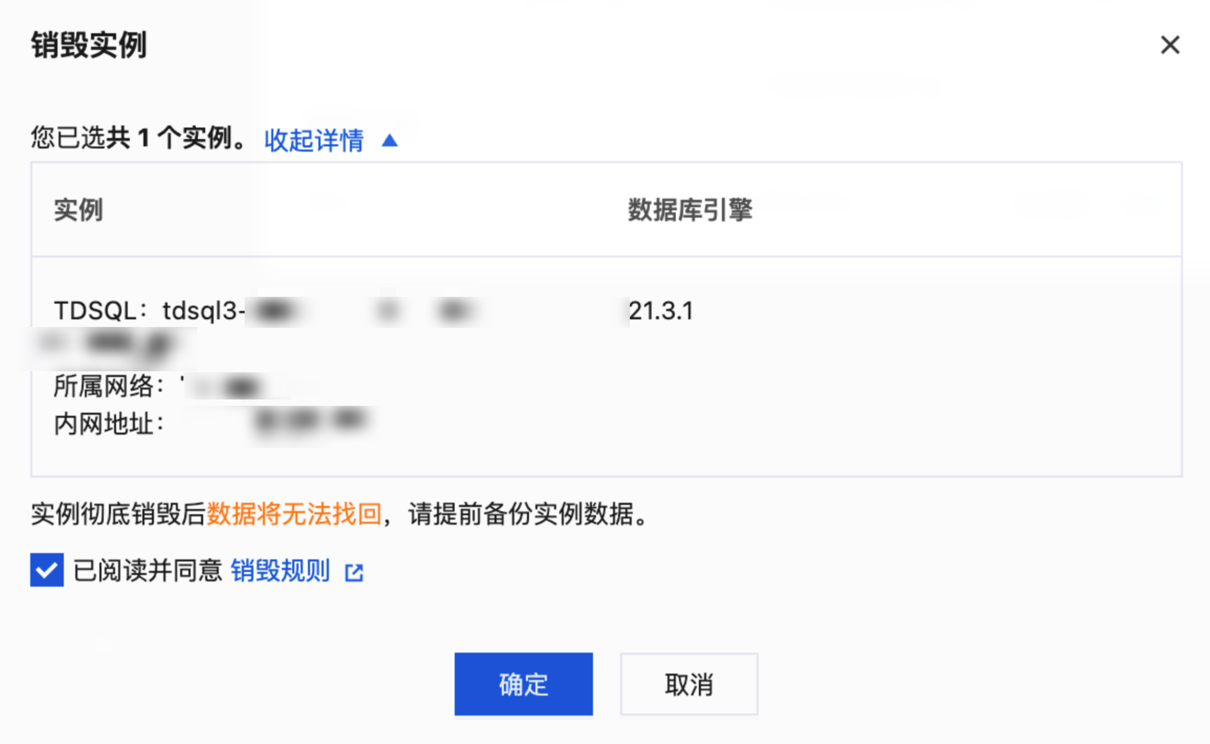 1. 登录 控制台,在实例列表中勾选实例,在上方操作栏选择更多操作 > 销毁/退货。 2. 在弹出的对话框中,仔细阅读并同意销毁规则,单击确定。