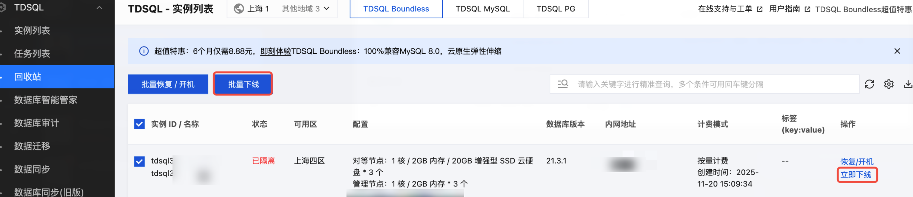 可以进入回收站中执行立即下线,将此实例彻底删除。