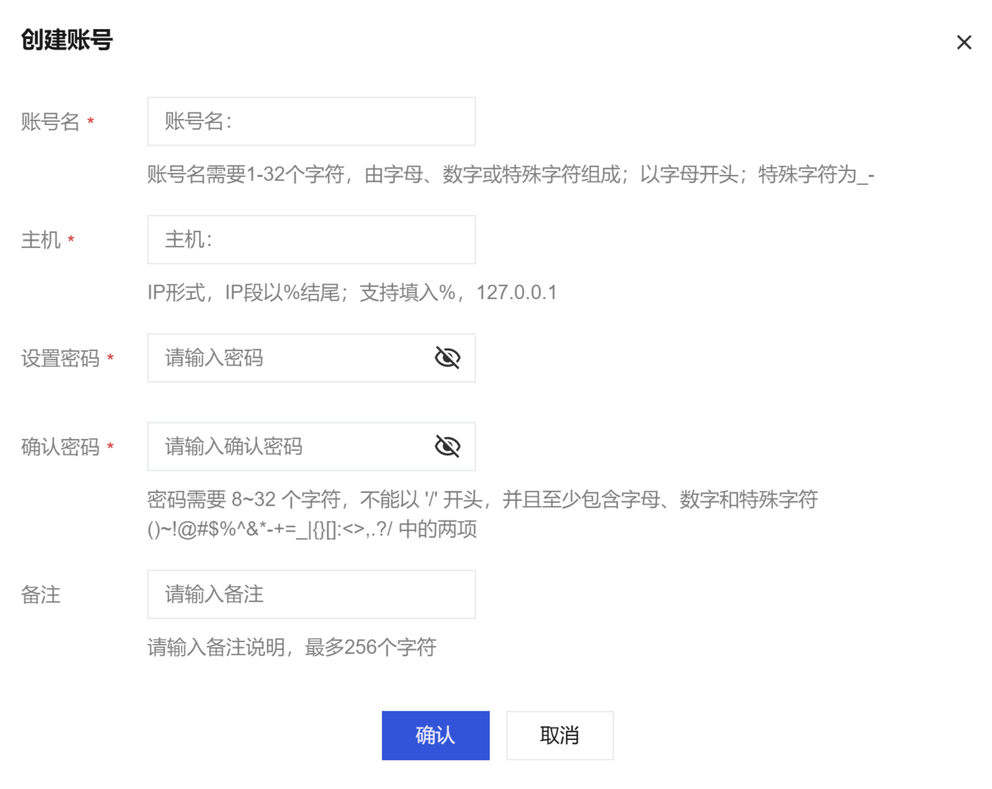 确认密码 | 再次输入账号密码,两次密码保持一致。 |