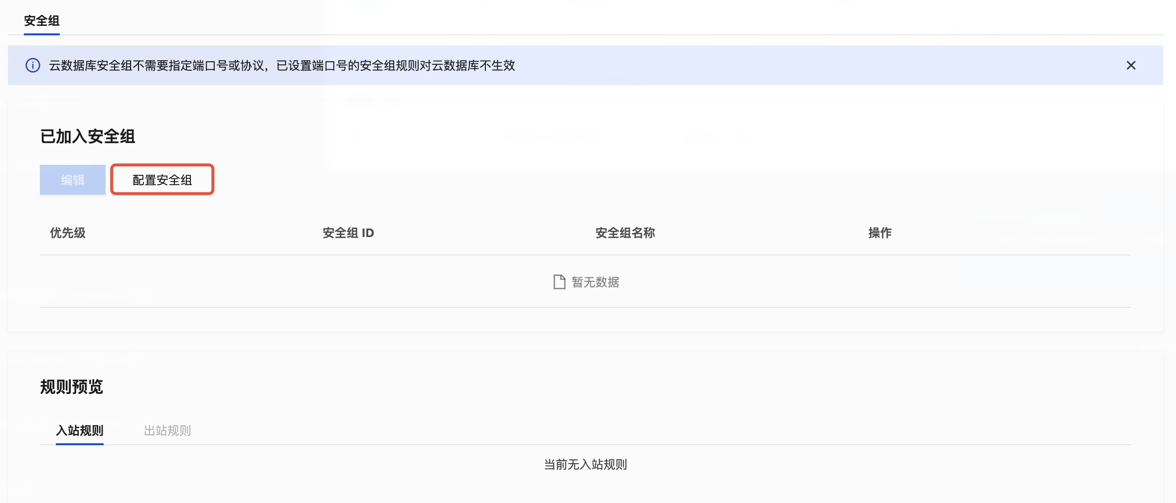 1. 登录 控制台,在实例列表,单击实例 ID,进入实例管理页面。 2. 在实例管理页面,选择数据安全性,单击配置安全组。