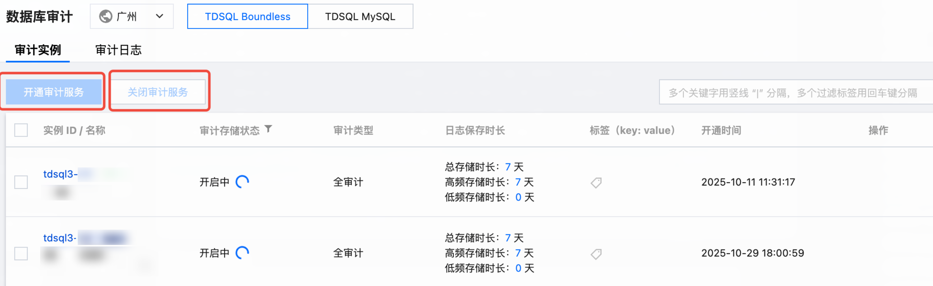 页的实例列表,选择需要开通/关闭审计服务的实例,进行实例审计配置。