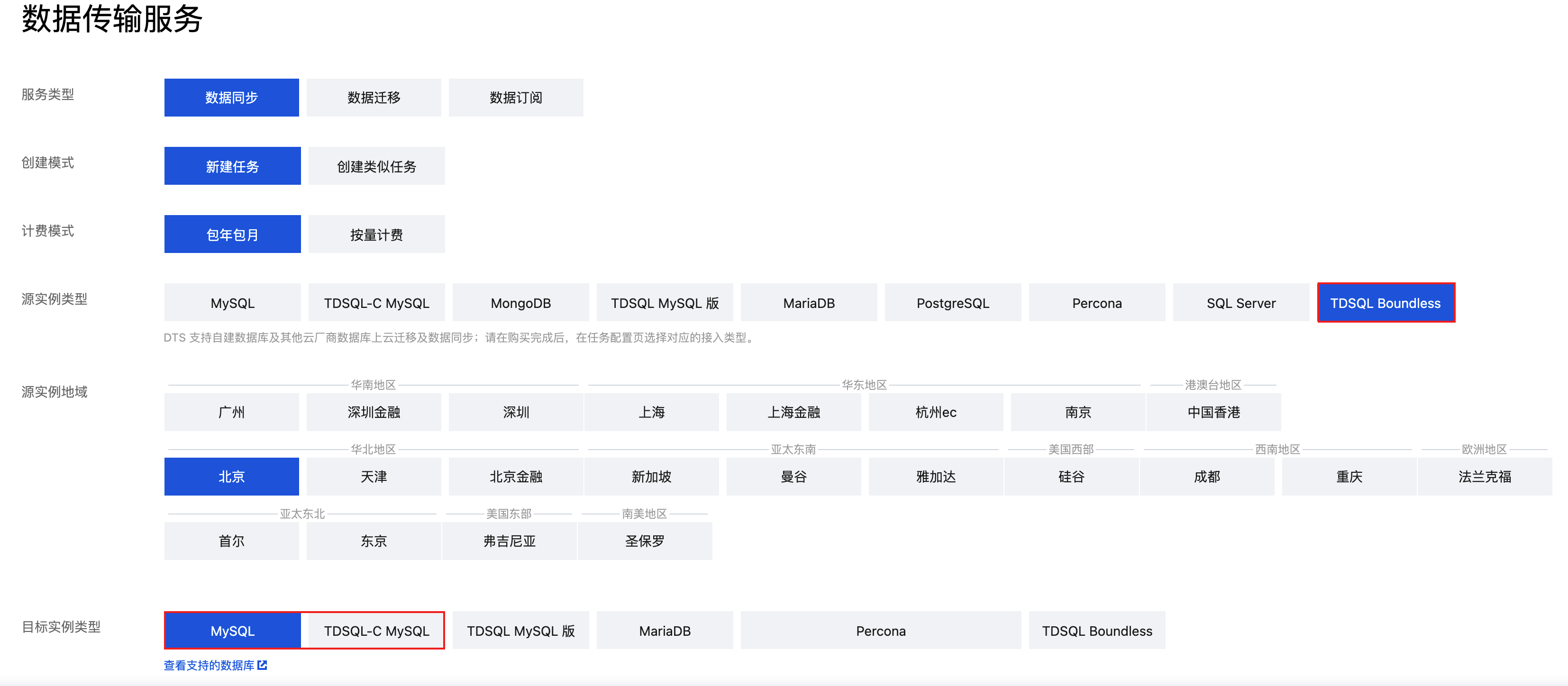 目标实例类型 | 根据业务需要,选择要同步的数据库类型。 当前支持的目标实例类型有 MySQL、TDSQL-C MySQL。 |